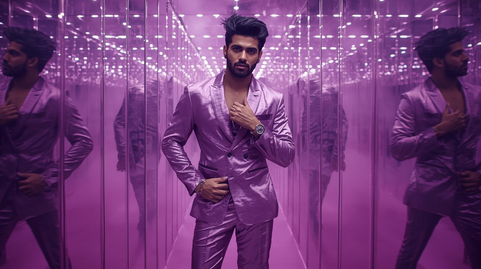 9. A glamorous Indian model with feathered hair and plum gloss, wearing a lavender metallic trouser