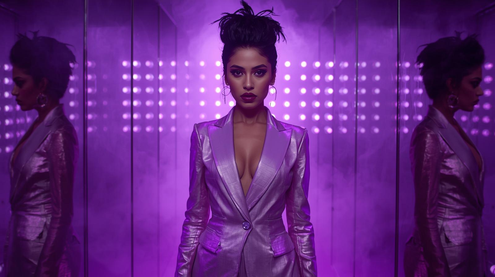 9. A glamorous Indian model with feathered hair and plum gloss, wearing a lavender metallic trouser
