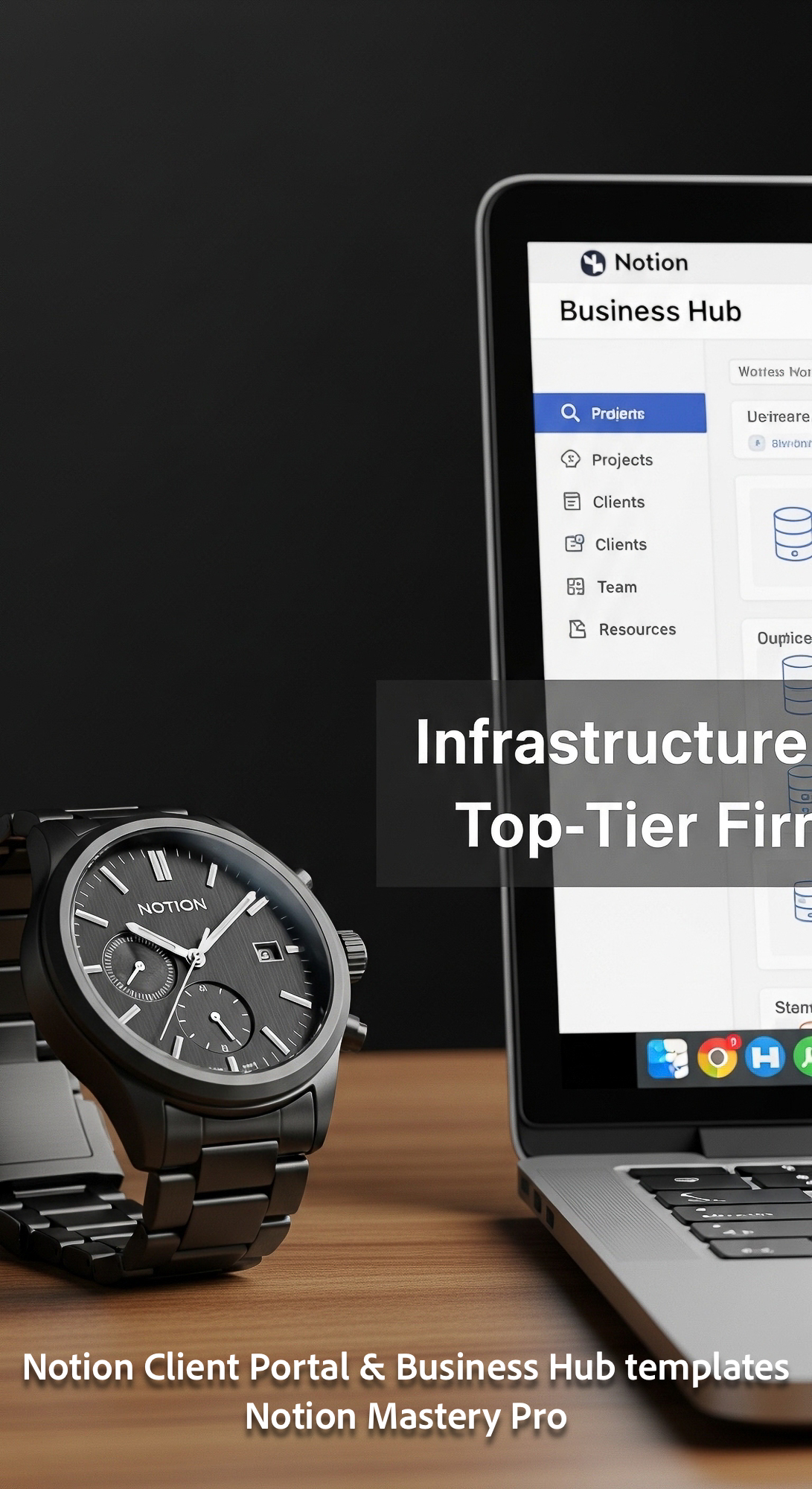 9 Closeup of a designer watch next to a laptop screen showing a Notion Business Hub with a stylized