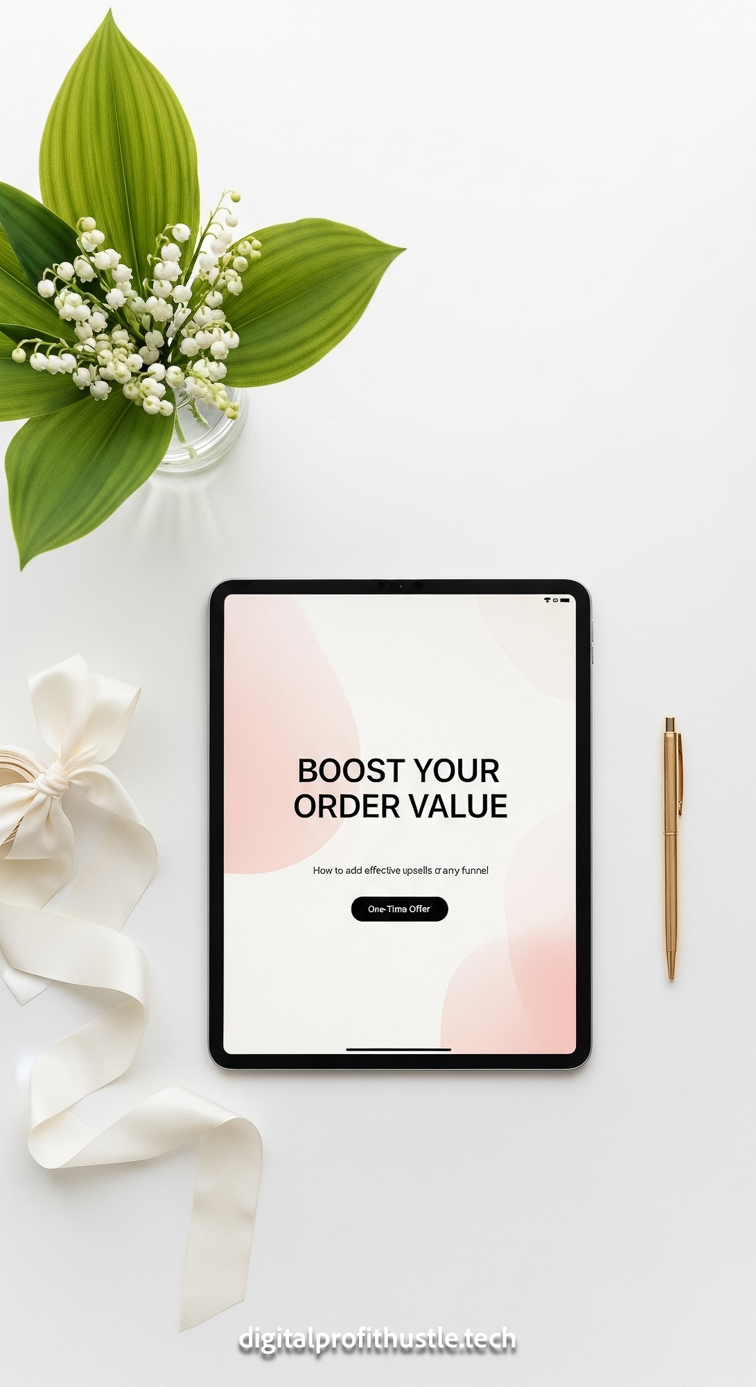 9 Flat lay of an iPad displaying a OneTime Offer page a gold pen a white silk ribbon and a small vas