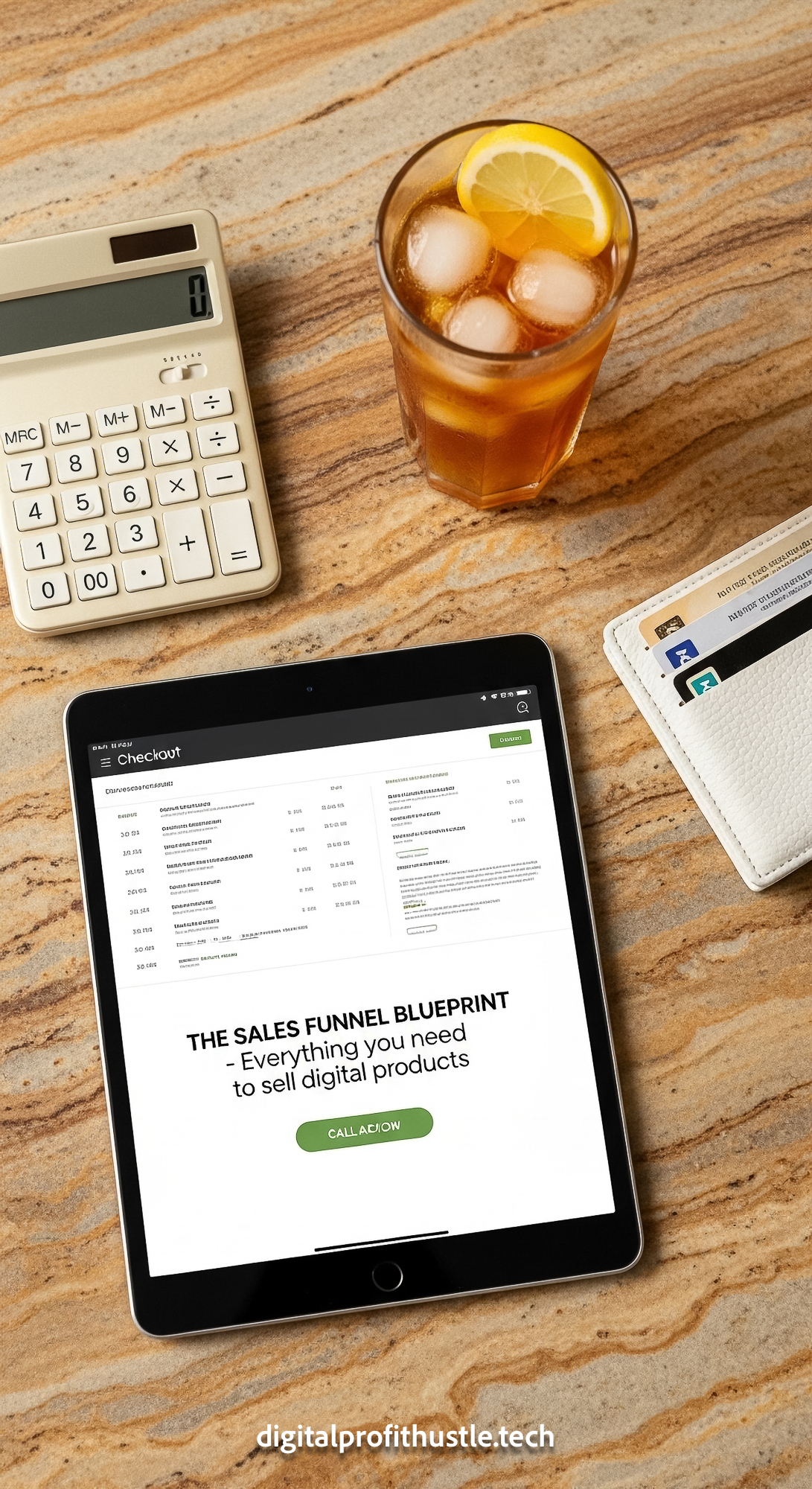 9 Overhead shot of a tablet showing a checkout page a gold calculator a white leather wallet and a g