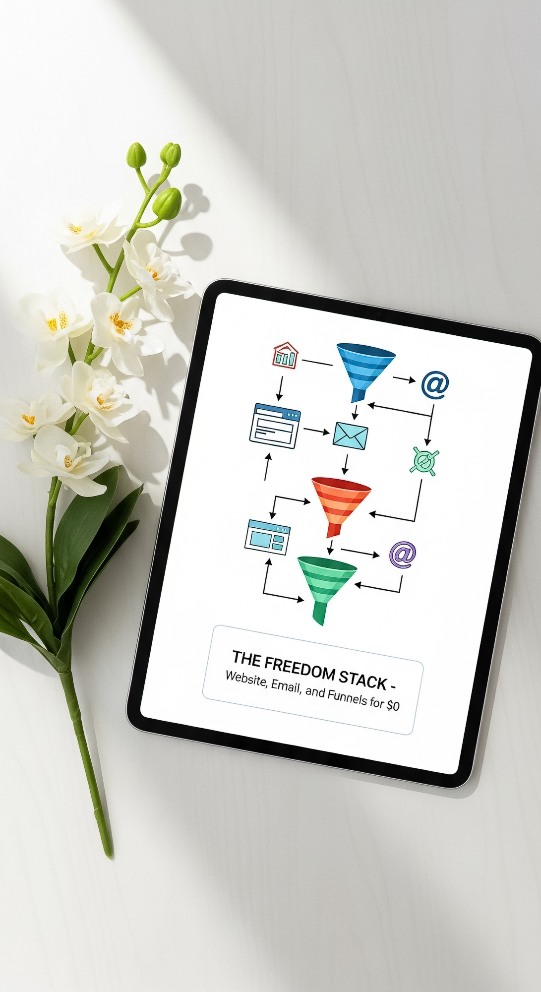 93 Flat lay of an iPad showing a funnel flowchart and a sprig of white orchids Text THE FREEDOM STAC