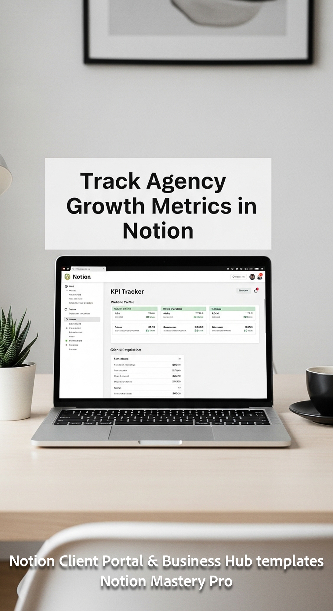 93 Minimalist desk with a black coffee cup and a laptop showing a Notion KPI Tracker Overlay Track A