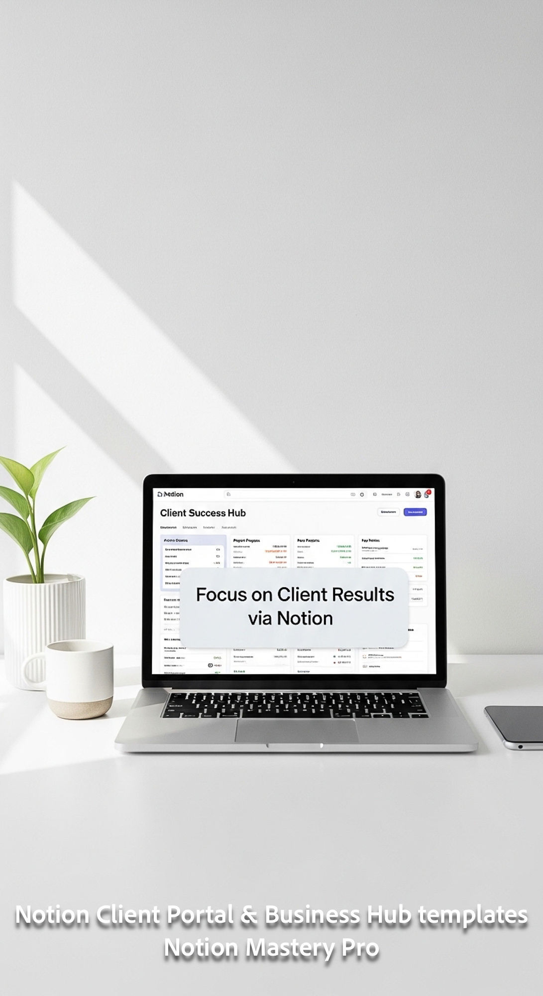 97 Minimalist white workspace with a laptop showing a Notion Client Success Hub Overlay Focus on Cli