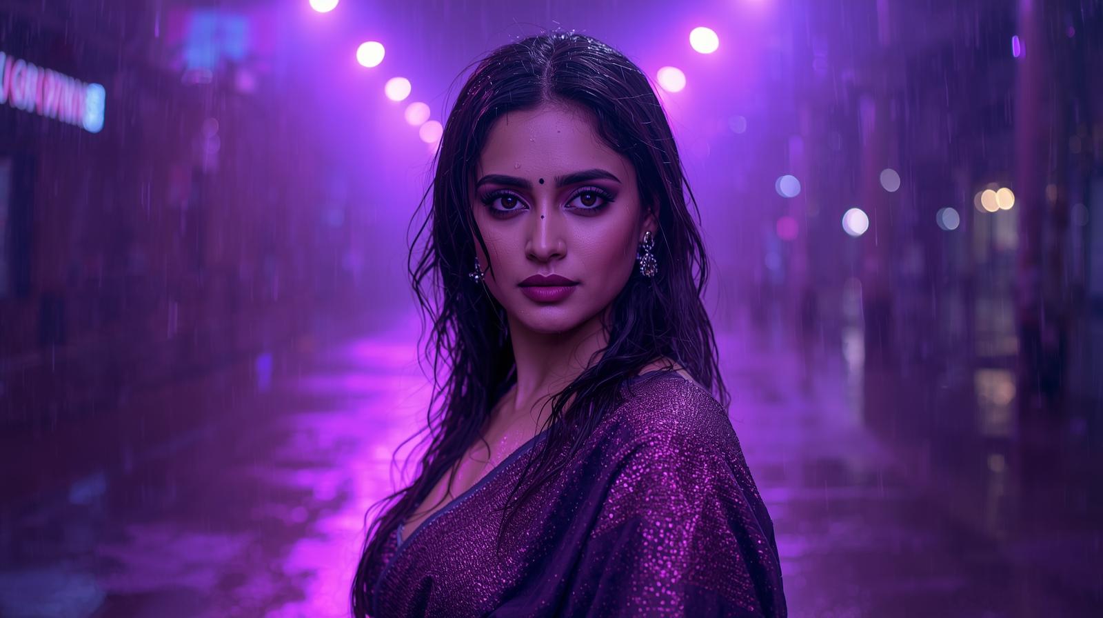 A beautiful Indian woman with wet hair and smoky purple eyeliner, wearing a shimmering deep violet s
