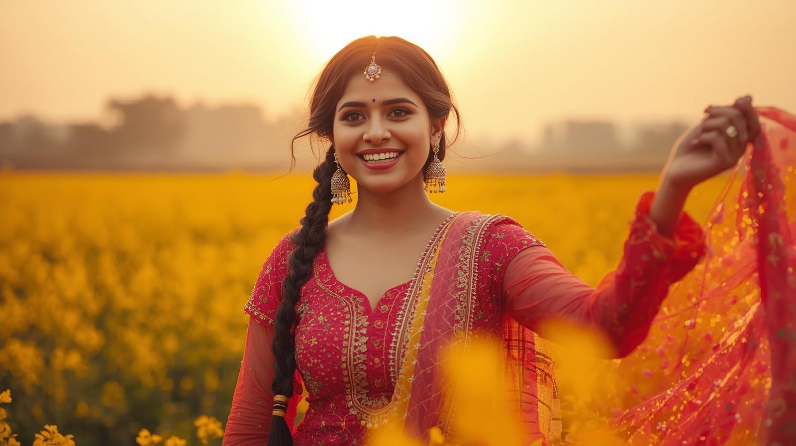 A beautiful Punjabi girl with braided hair, jhumkas, wearing a bright phulkari suit, standing in a m