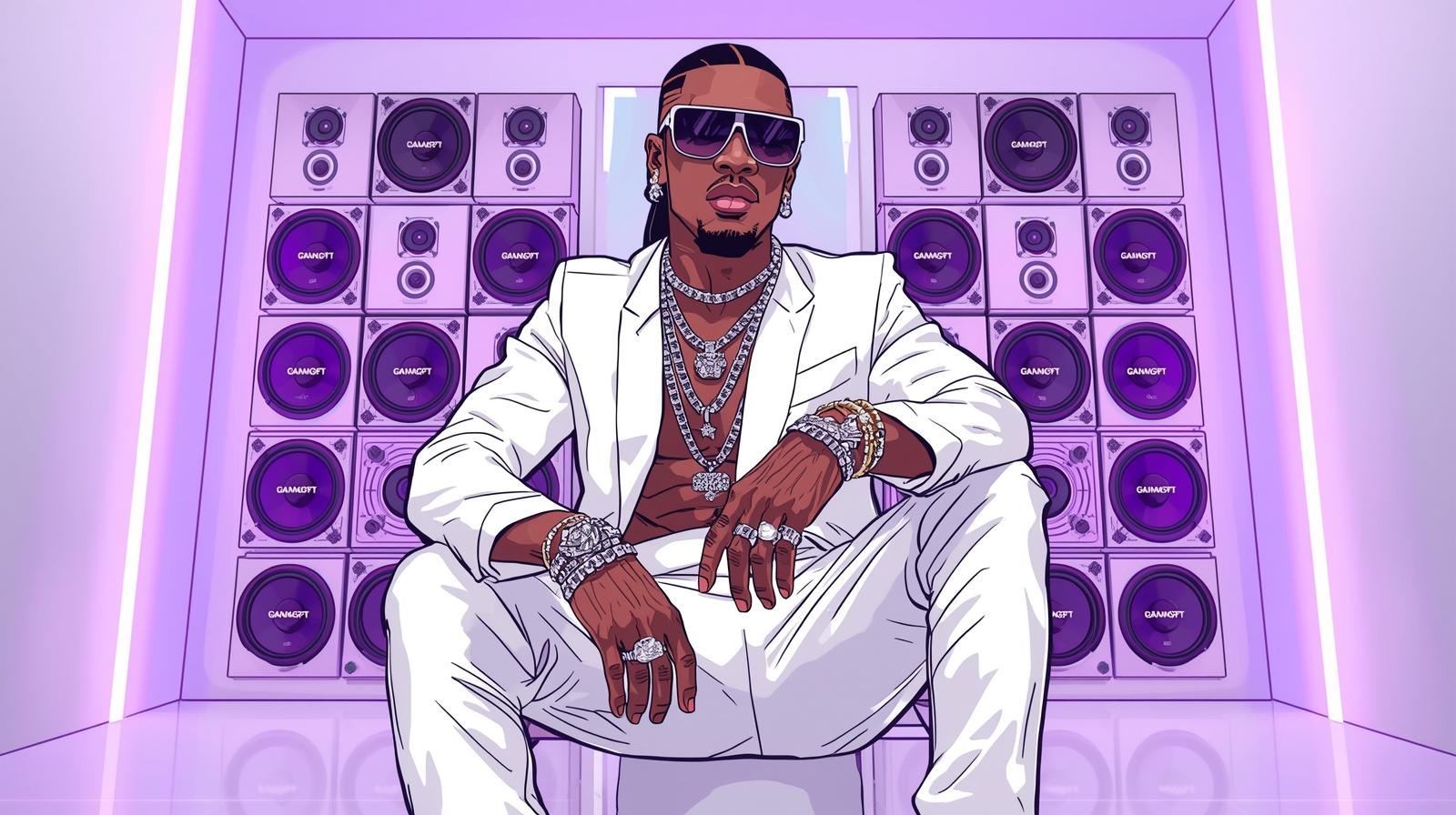 A Bollywood rap superstar, lean and stylish, wearing white designer streetwear, diamond chains, ring