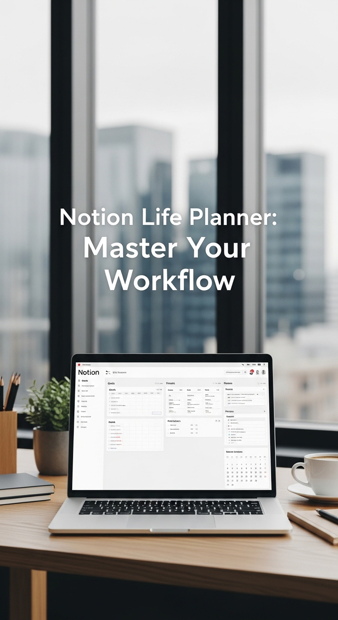 A bright office with a laptop showing a Notion Life Planner overlay text Notion Life Planner Master