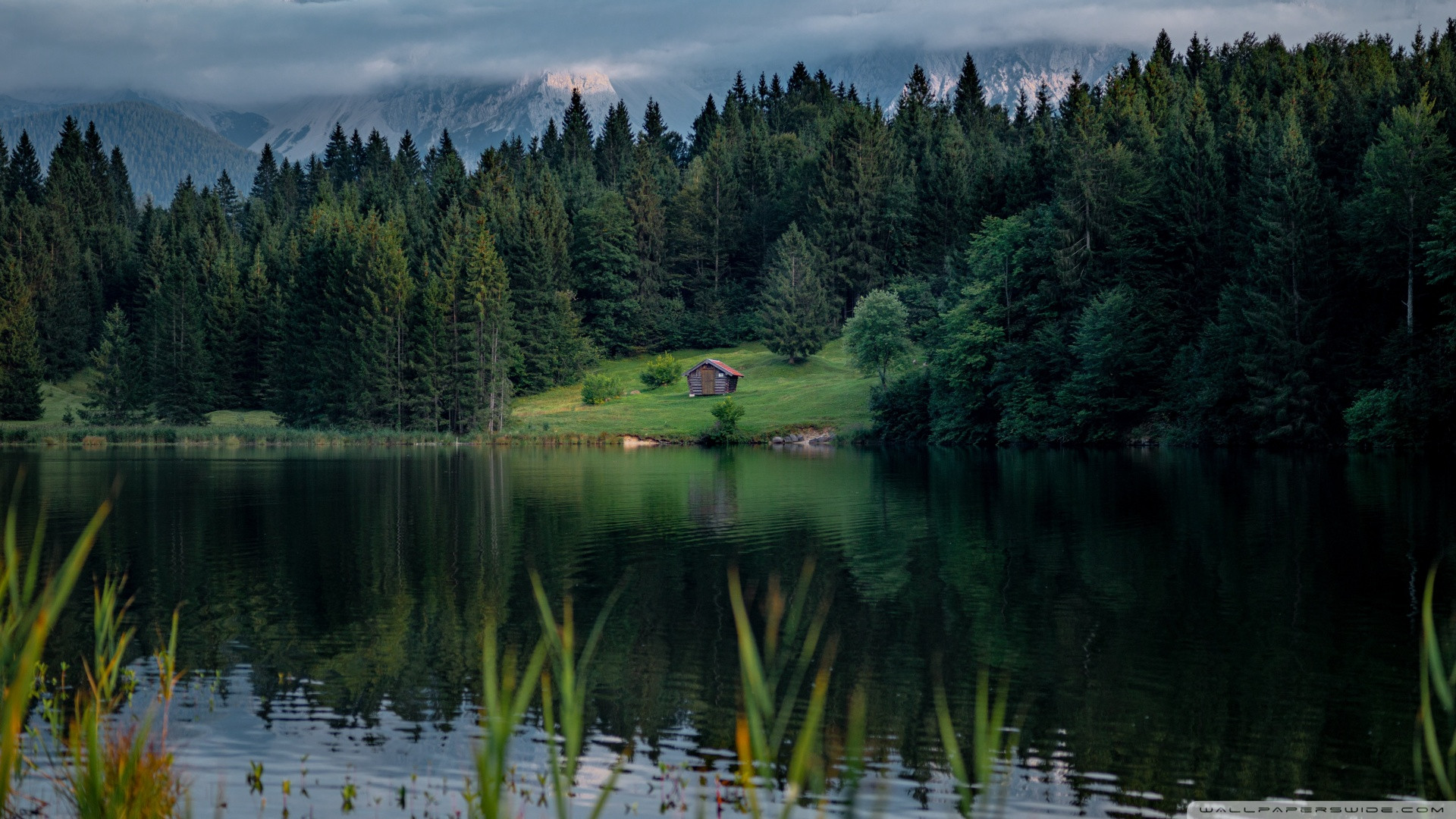 a cabin by the lake amidst majestic mountains wallpaper 1920x1080