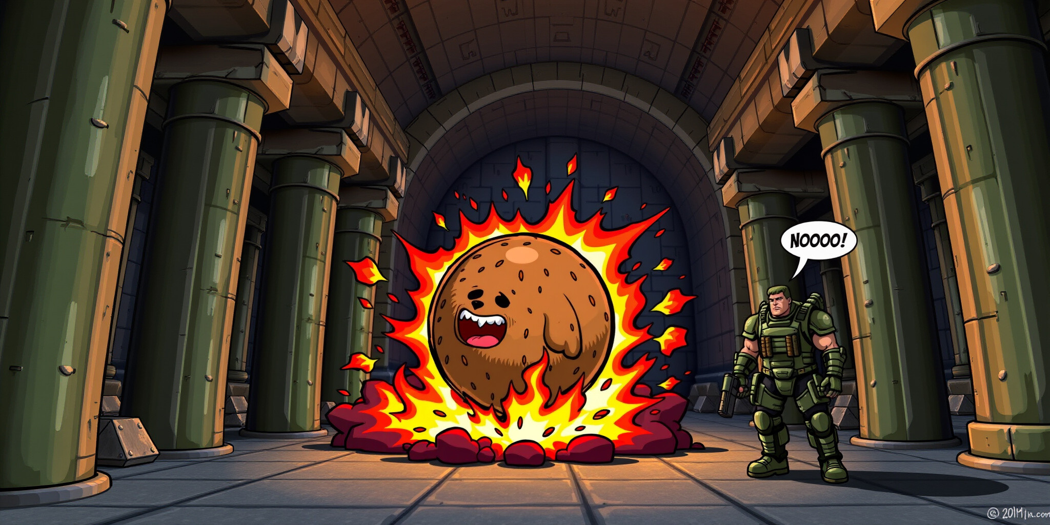 A chaotic and humorous scene in the industrial environment of Doom II where Big Belly Bob attempts a