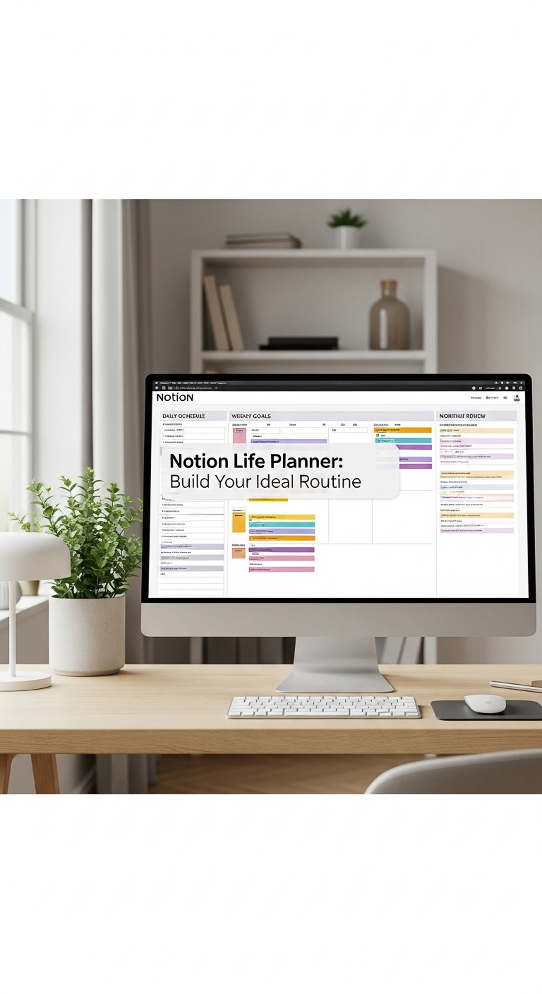 A clean home office with a large monitor showing a Notion Life Planner overlay text Notion Life Plan