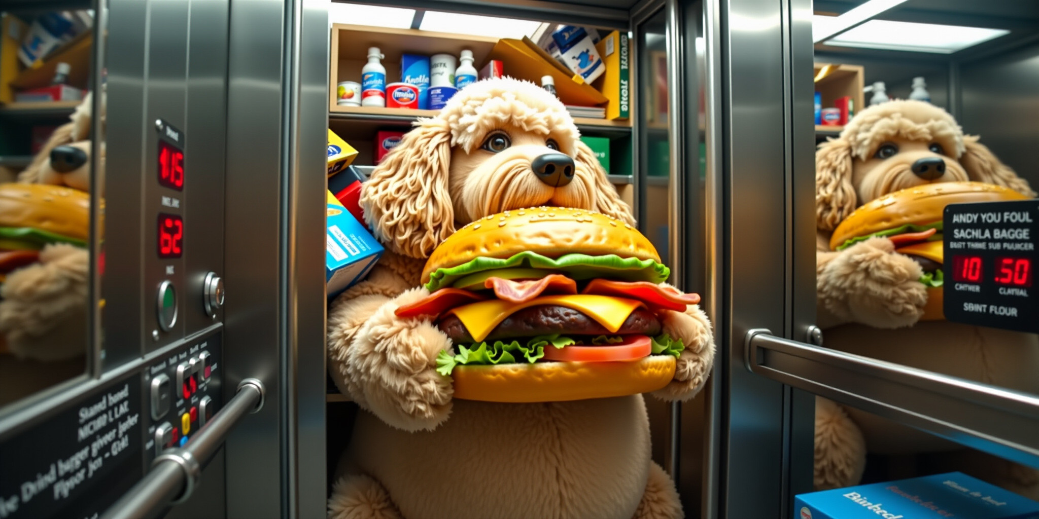 A comedic scene featuring Big Belly Bob the plush labradoodle with an absurdly large spherical bell
