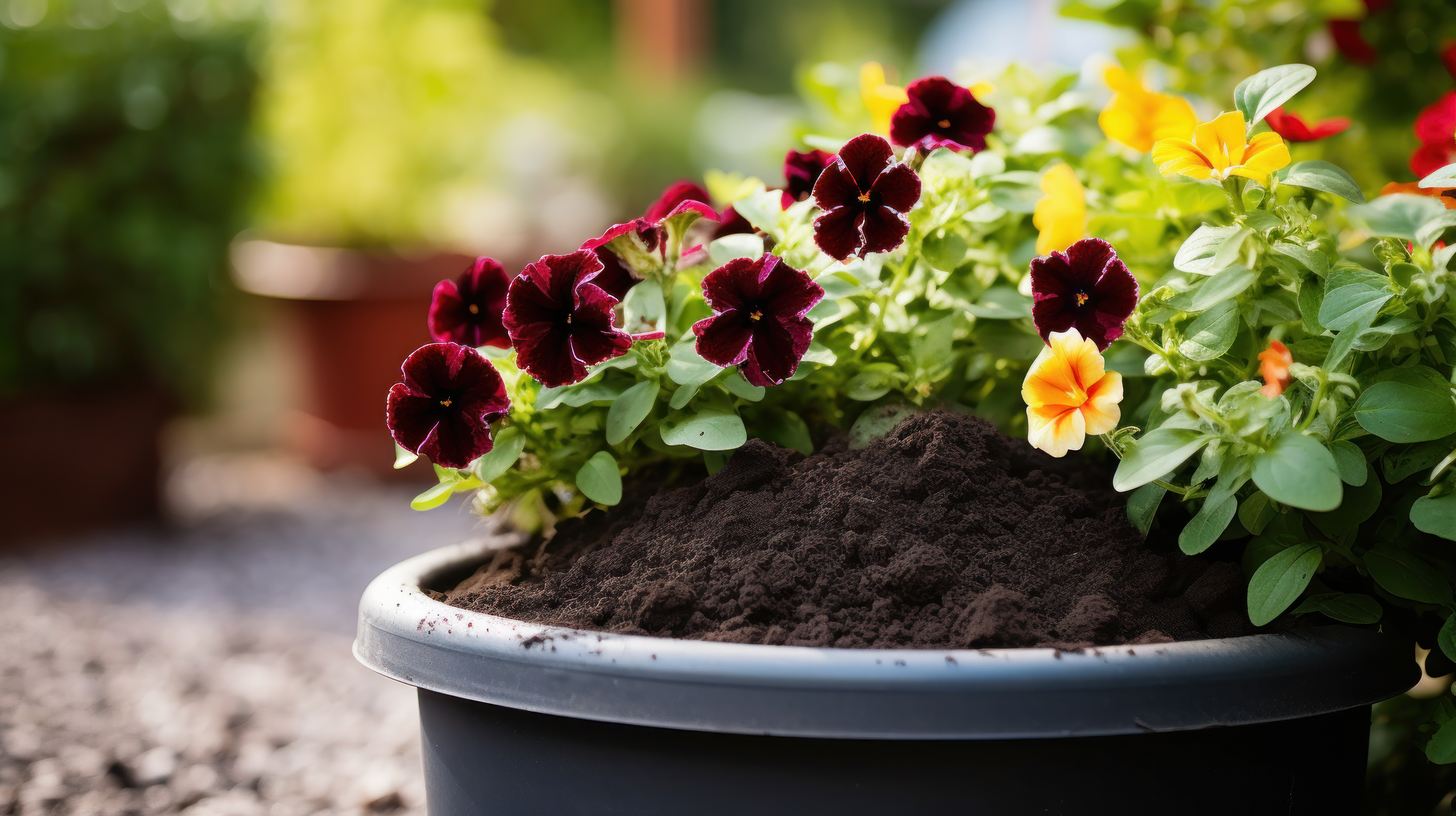 A container filled with biochar stands in a garden with green plants and colorful flowers in the bac