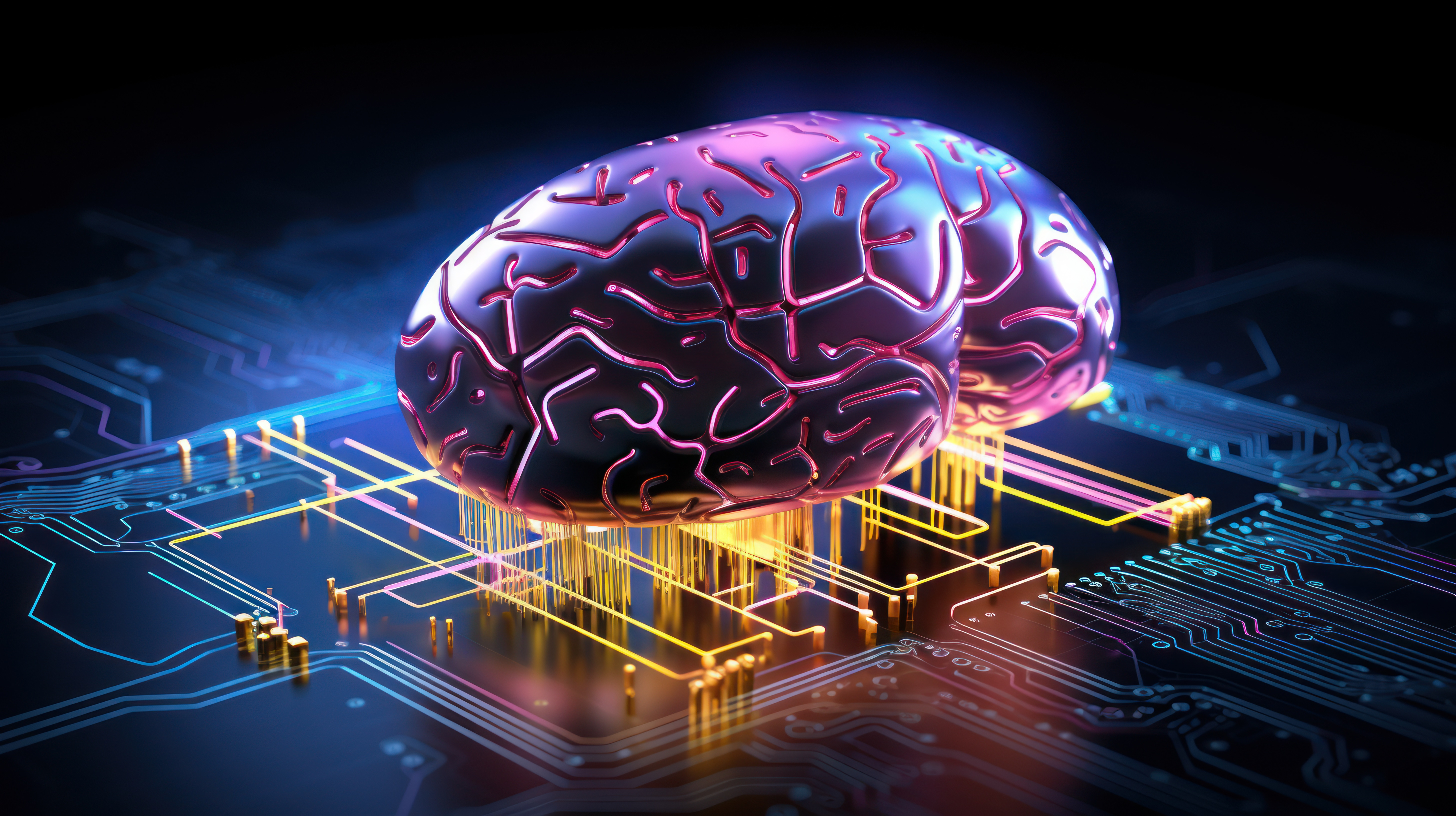 A creative image of a glowing neon brain with chips microcircuits metal and wires in pink blue yello
