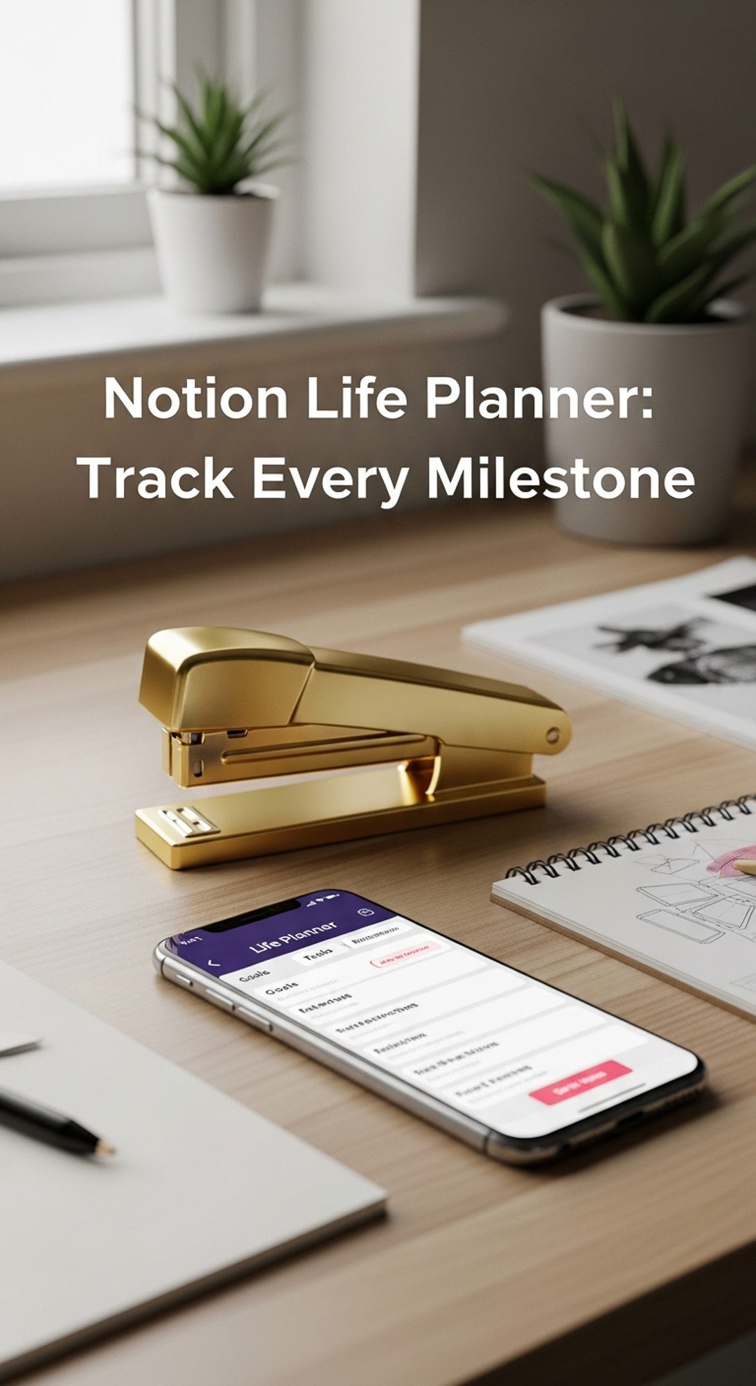 A designers desk with a gold stapler and a phone showing a Life Planner overlay text Notion Life Pla