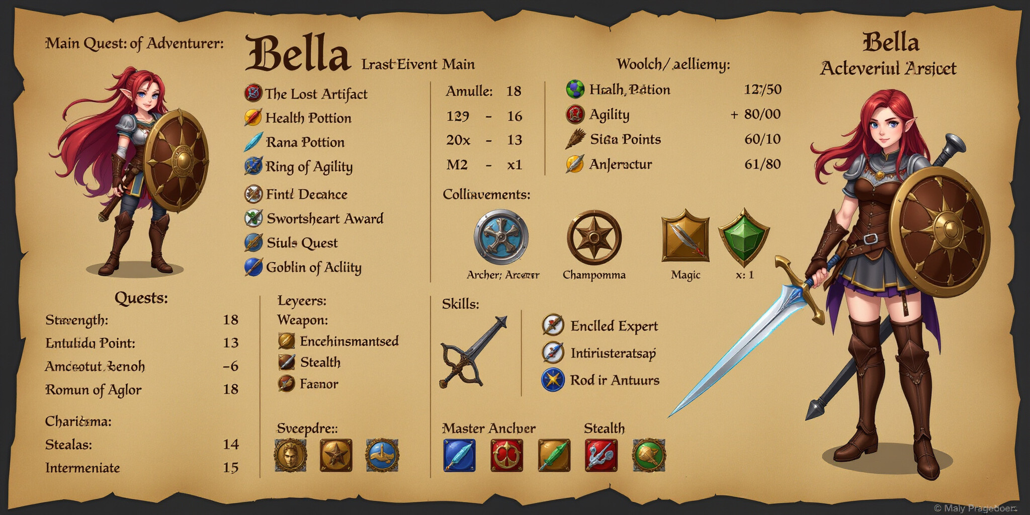 A detailed RPG character sheet featuring Bella as the main character presented in a stylized medieva