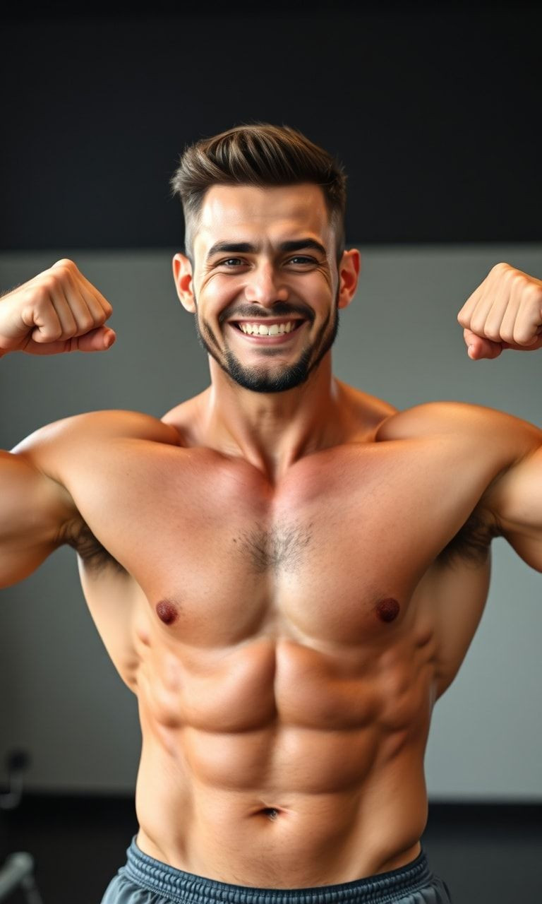a fit individual flexing their muscles with a triumphant smile