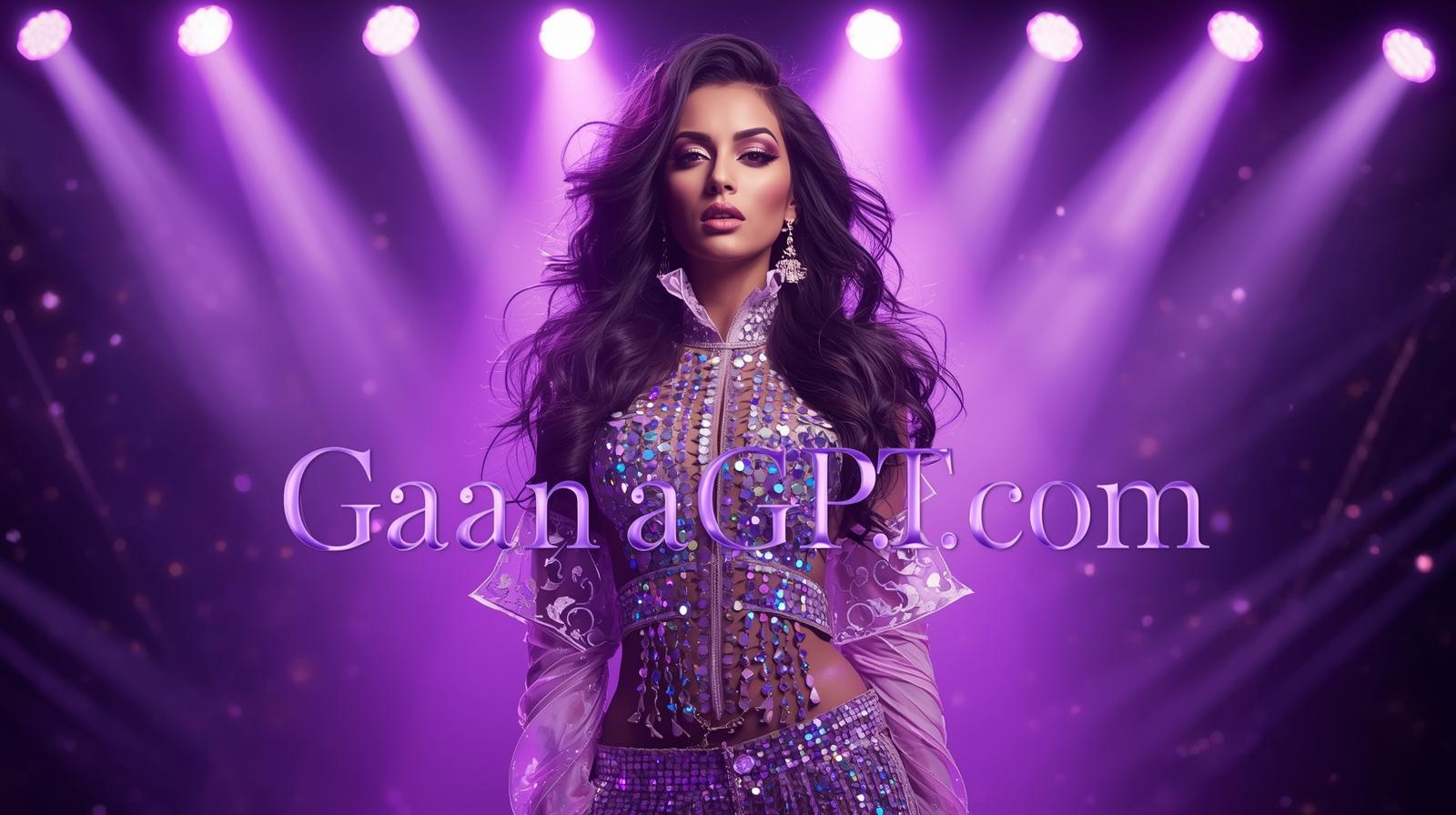 A glamorous Bollywood popstar woman in a neon purple spotlight, bold makeup, holographic outfit, dra