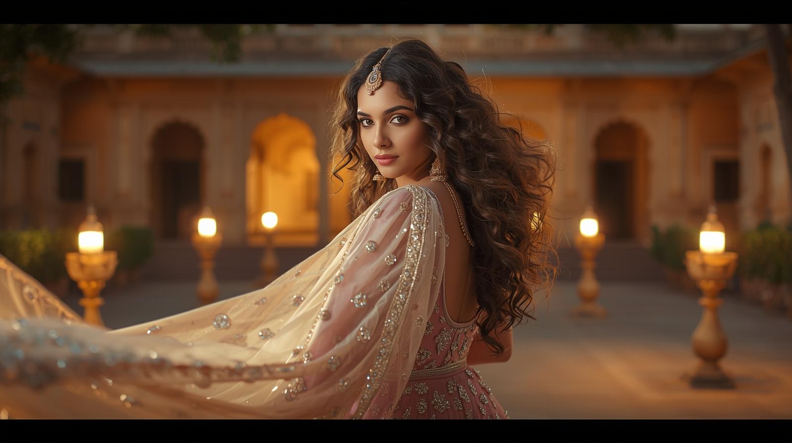 A gorgeous Indian woman with hazel eyes and curly hair, wearing a royal pastel lehenga with mirror w
