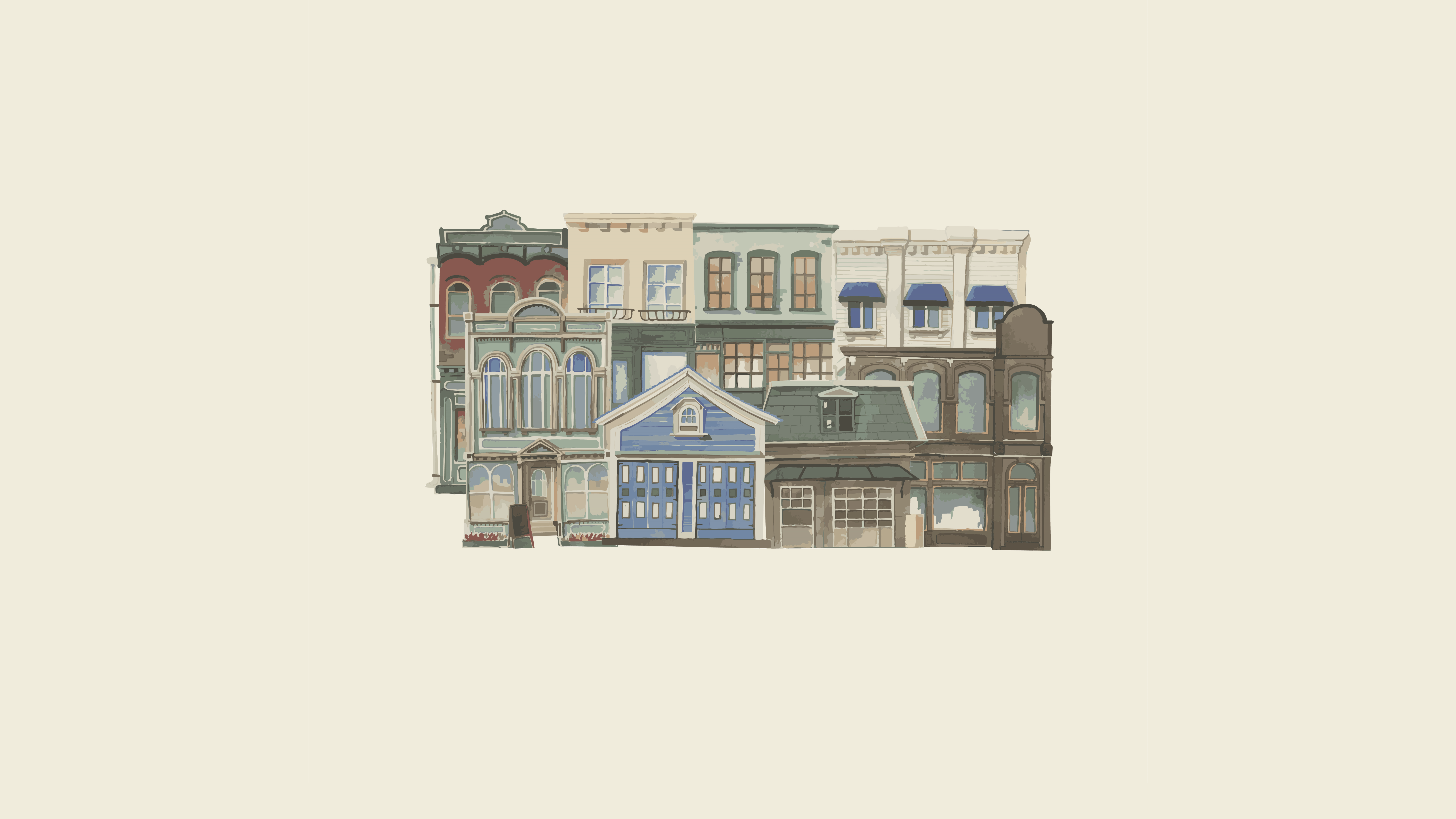 a group of buildings with blue awnings