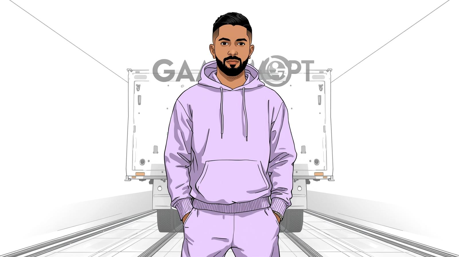 A handsome Bollywood rapper with trimmed beard, undercut hairstyle, wearing light purple streetwear