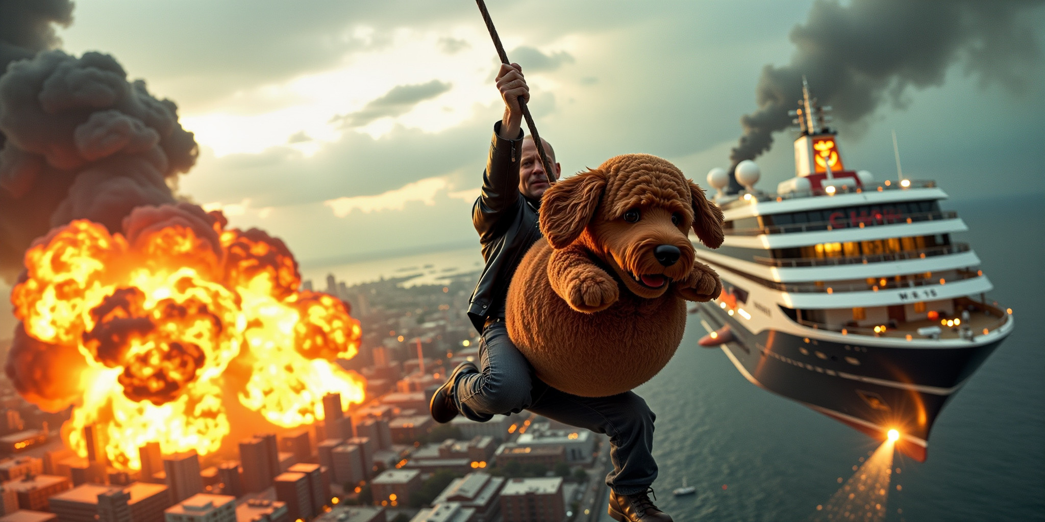 A high energy cinematic scene featuring Bruce Willis and Big Belly Bob BBB swinging away from a mass