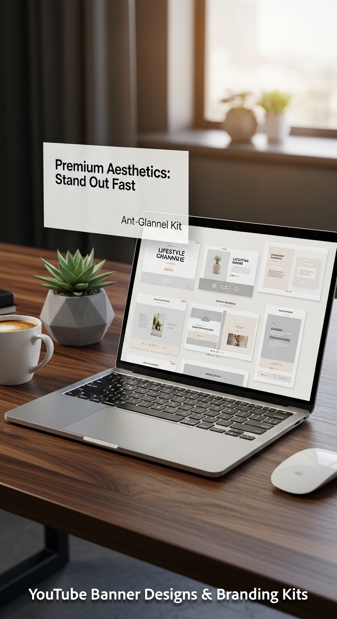 A highend desk with a laptop displaying a cohesive lifestyle channel kit overlay text Premium Aesthe