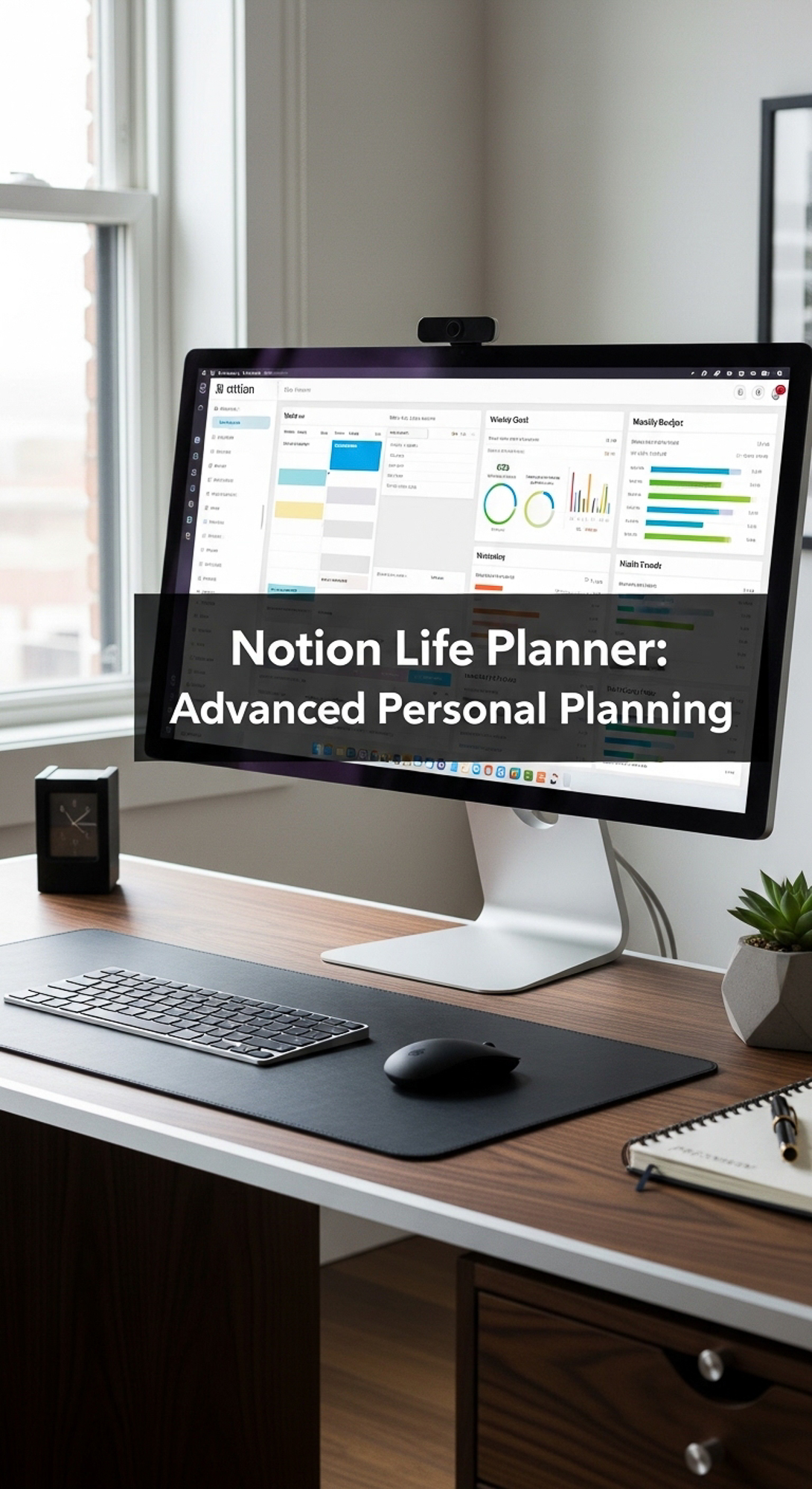 A highend desk with a screen showing a Notion Life Planner overlay text Notion Life Planner Advanced