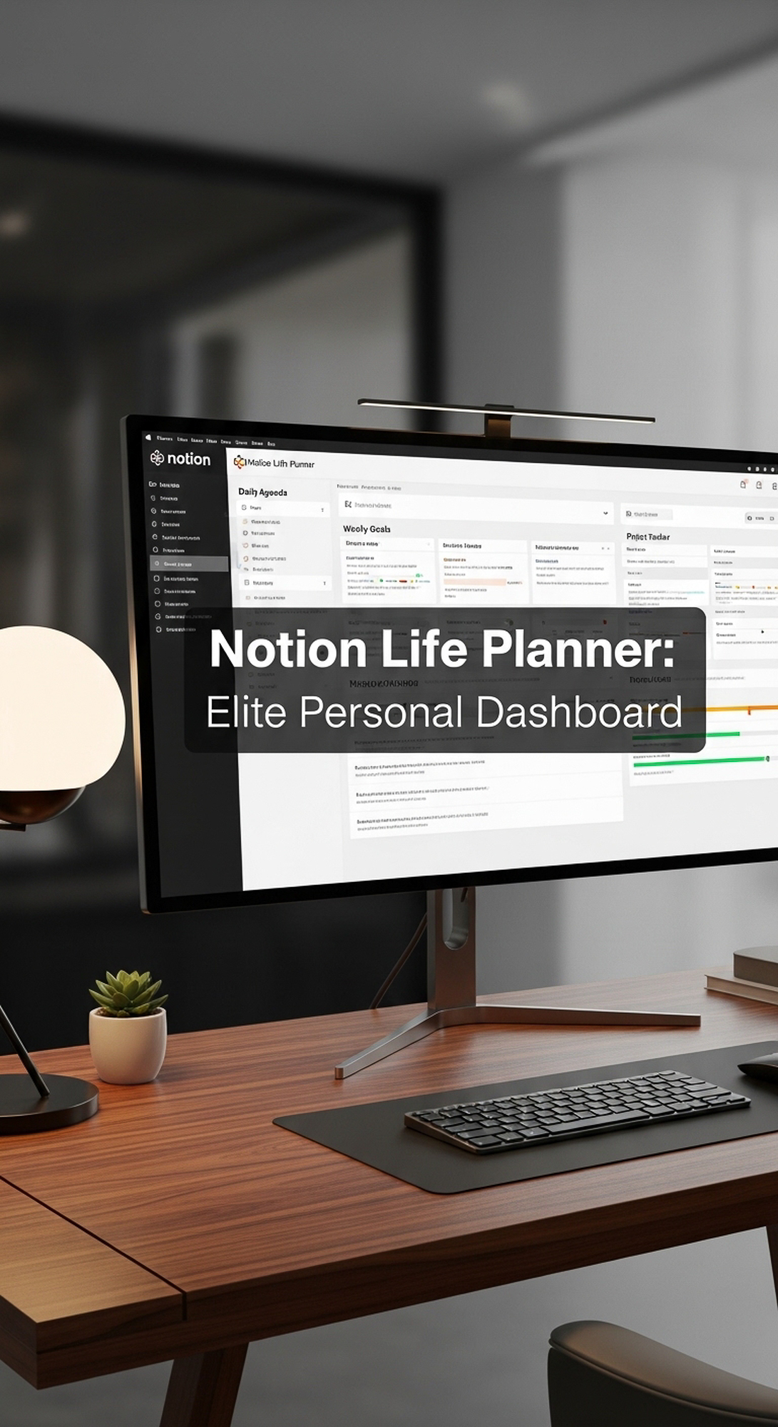 A highend desk with a screen showing a Notion Life Planner overlay text Notion Life Planner Elite Pe