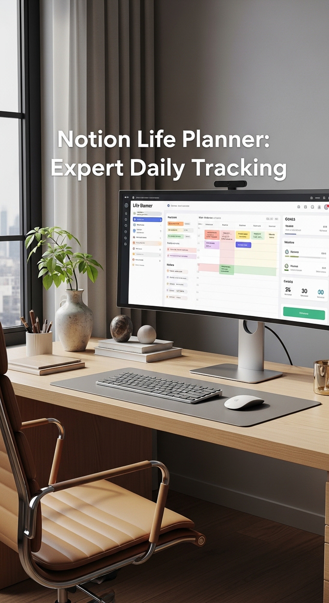 A highend workspace with a screen showing a Life Planner overlay text Notion Life Planner Expert Dai