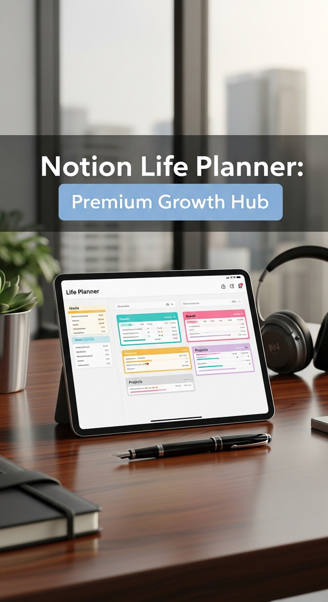 A luxury workspace with a tablet showing a Life Planner overlay text Notion Life Planner Premium Gro