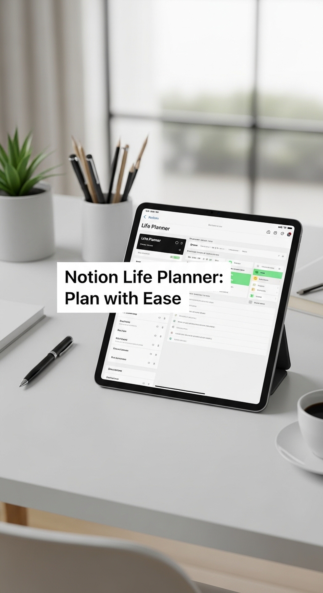 A minimalist desk with an iPad showing a Life Planner overlay text Notion Life Planner Plan with Eas