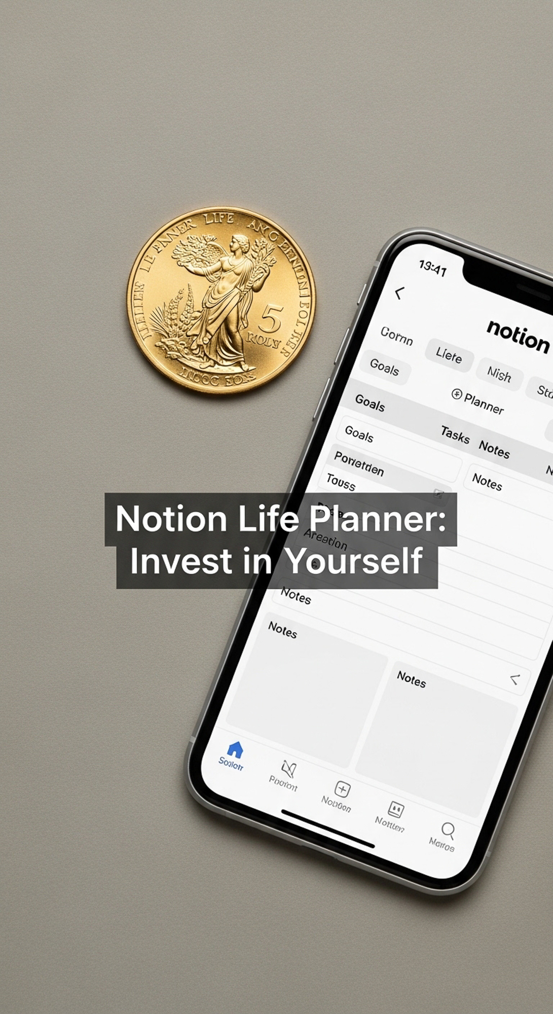 A minimalist flatlay with a gold coin and a phone showing a Notion Life Planner overlay text Notion