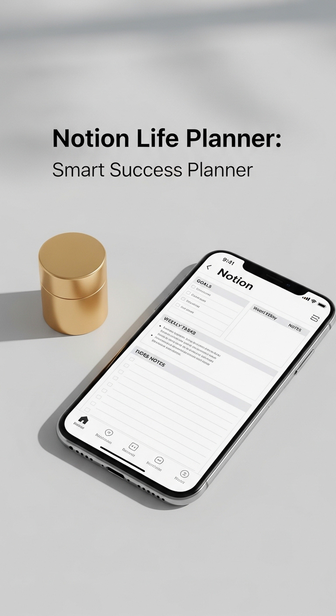 A minimalist flatlay with a gold paperweight and a phone showing a Notion Life Planner overlay text