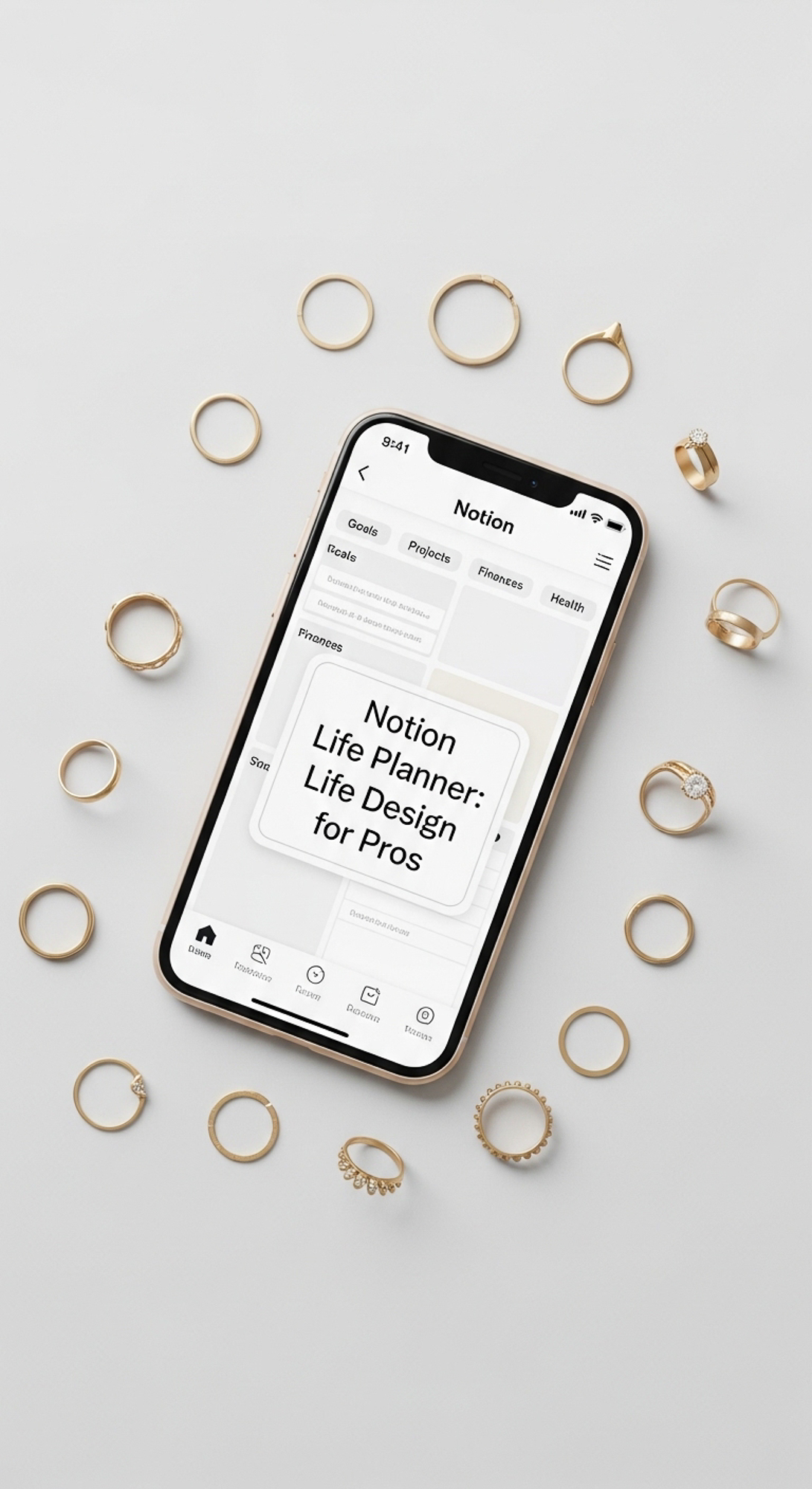 A minimalist flatlay with gold rings and a phone showing a Notion Life Planner overlay text Notion L