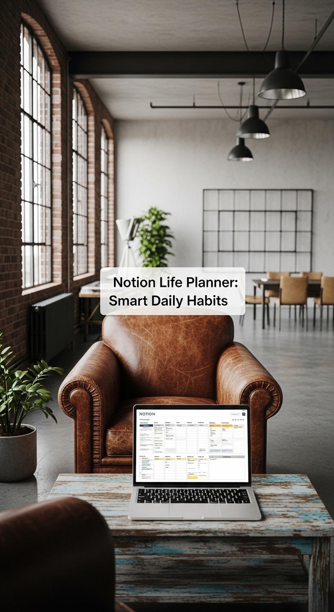 A minimalist industrial loft with a laptop showing a Notion Life Planner overlay text Notion Life Pl