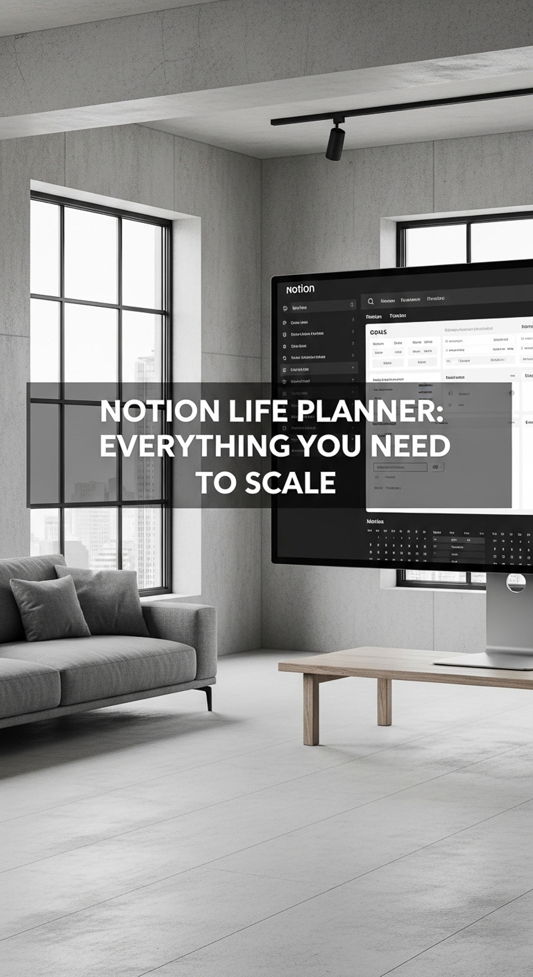 A minimalist loft with a Notion Life Planner on screen overlay text Notion Life Planner Everything Y
