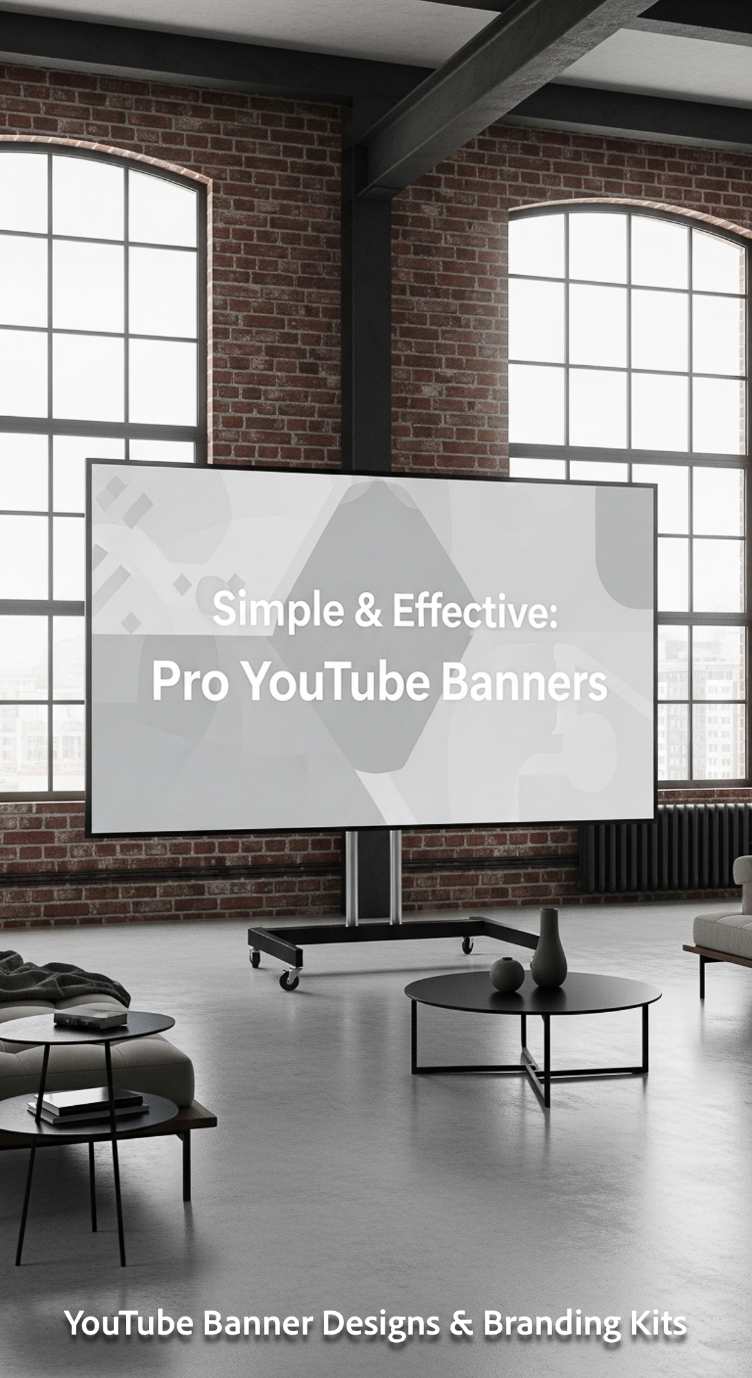 A minimalist loft with a screen displaying a generic branding placeholder overlay text Simple Effect