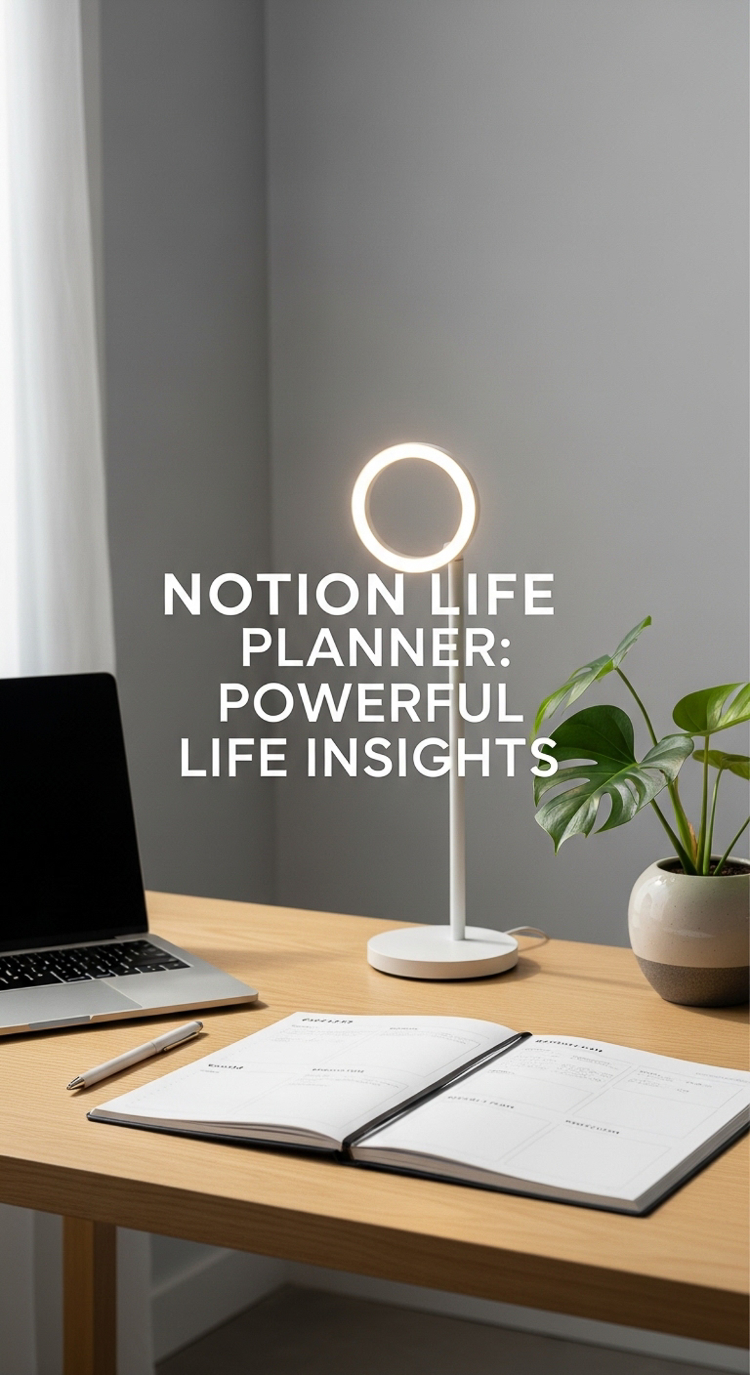 A minimalist studio desk with a Notion Life Planner overlay text Notion Life Planner Powerful Life I