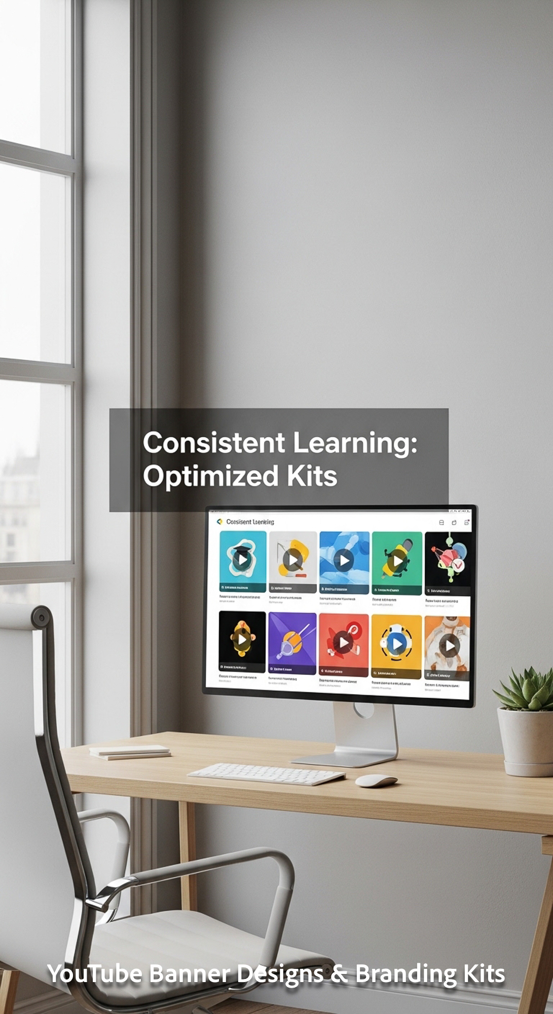 A minimalist workspace with a large window a monitor showing an educational thumbnail grid overlay t