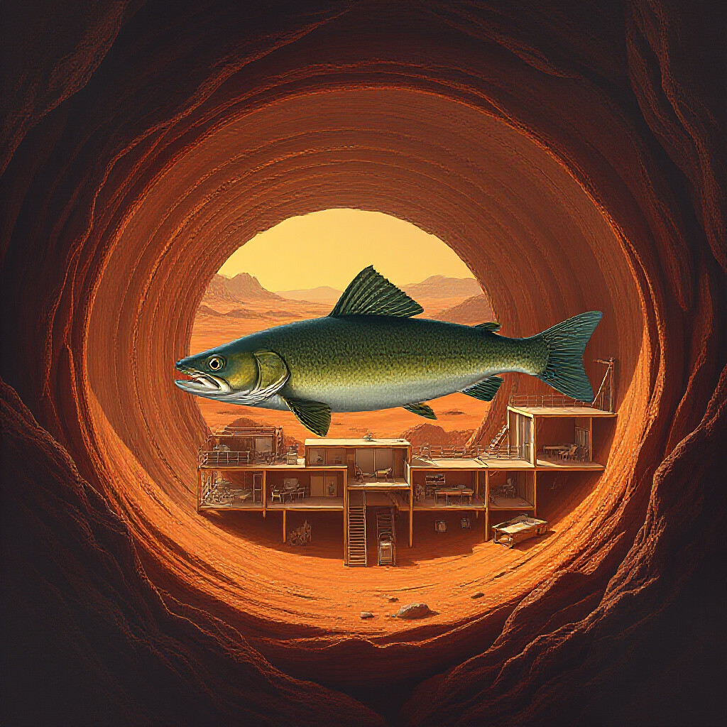 a muskellunge fish inside of a lava tube on Mars in a cutaway diagram of a Mars colony building