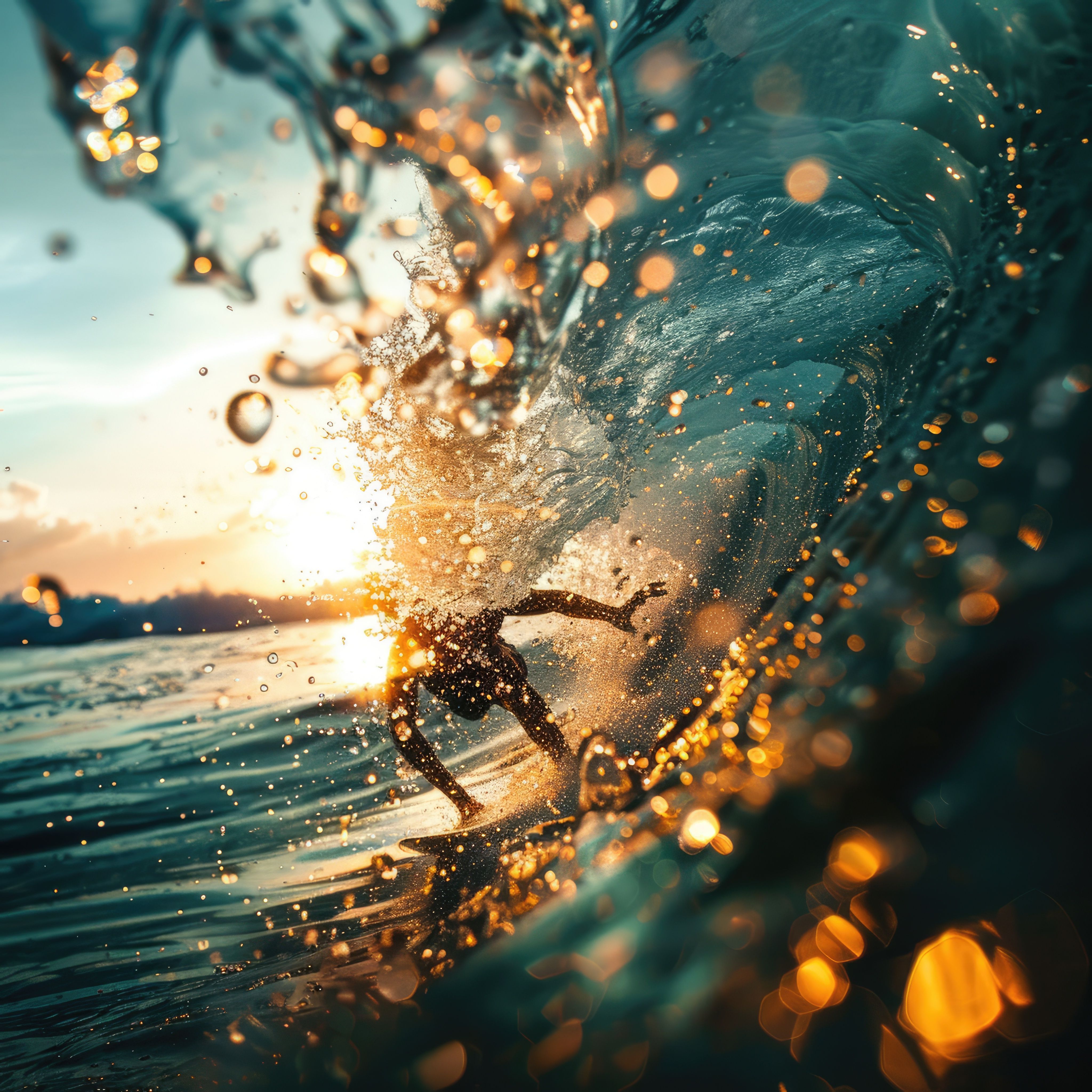 A person is happily riding a wave on a surfboard in the liquid world of the ocean, surrounded by the