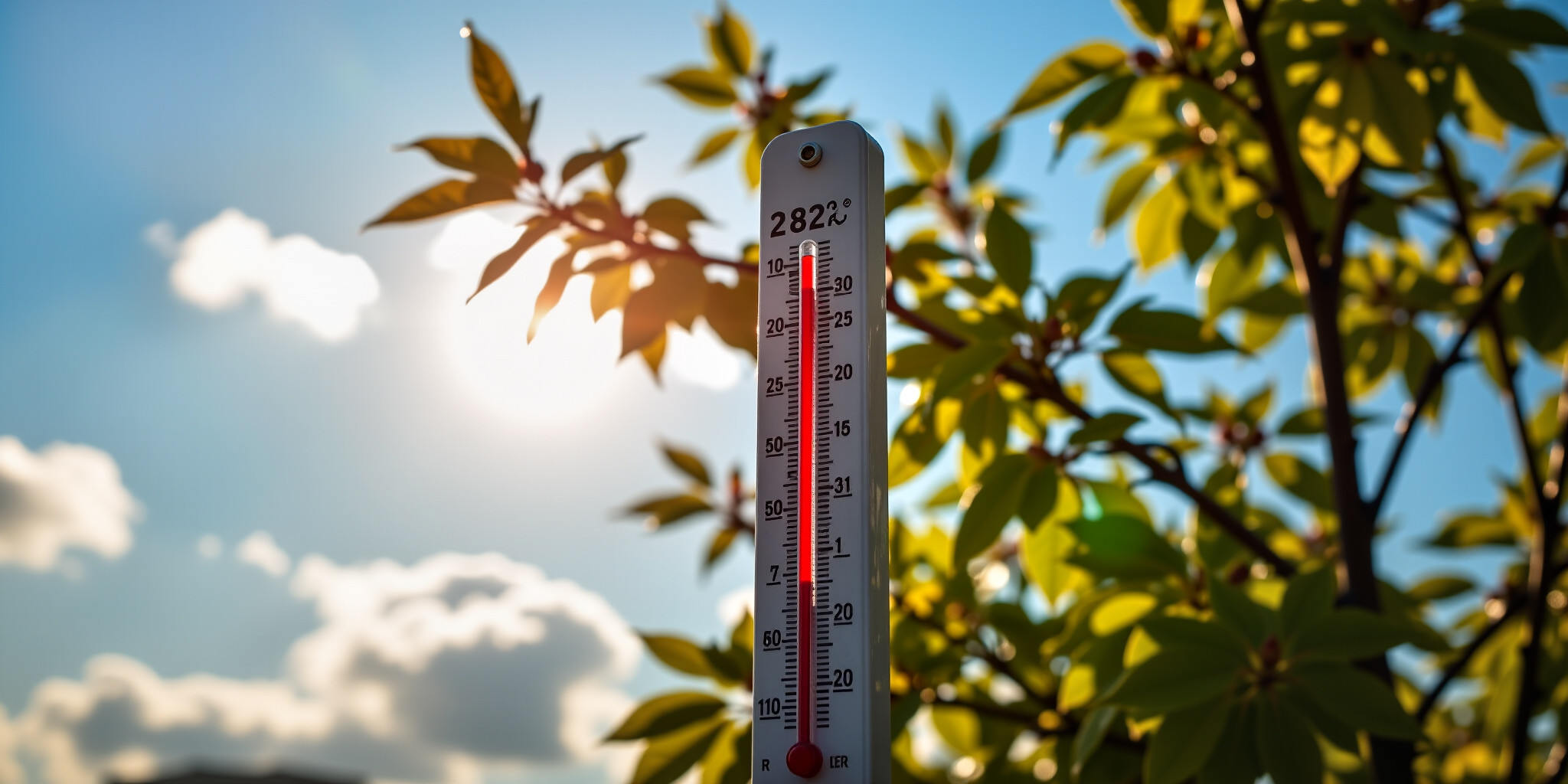 A photorealistic image of a thermometer displaying 28 2 degrees Celsius in Berlin Germany The backgr