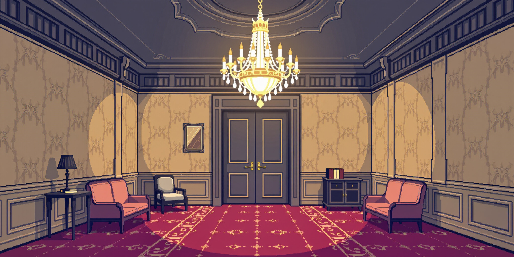 A pixel art waiting room inspired by Deltarune featuring a grand chandelier hanging from the ceiling