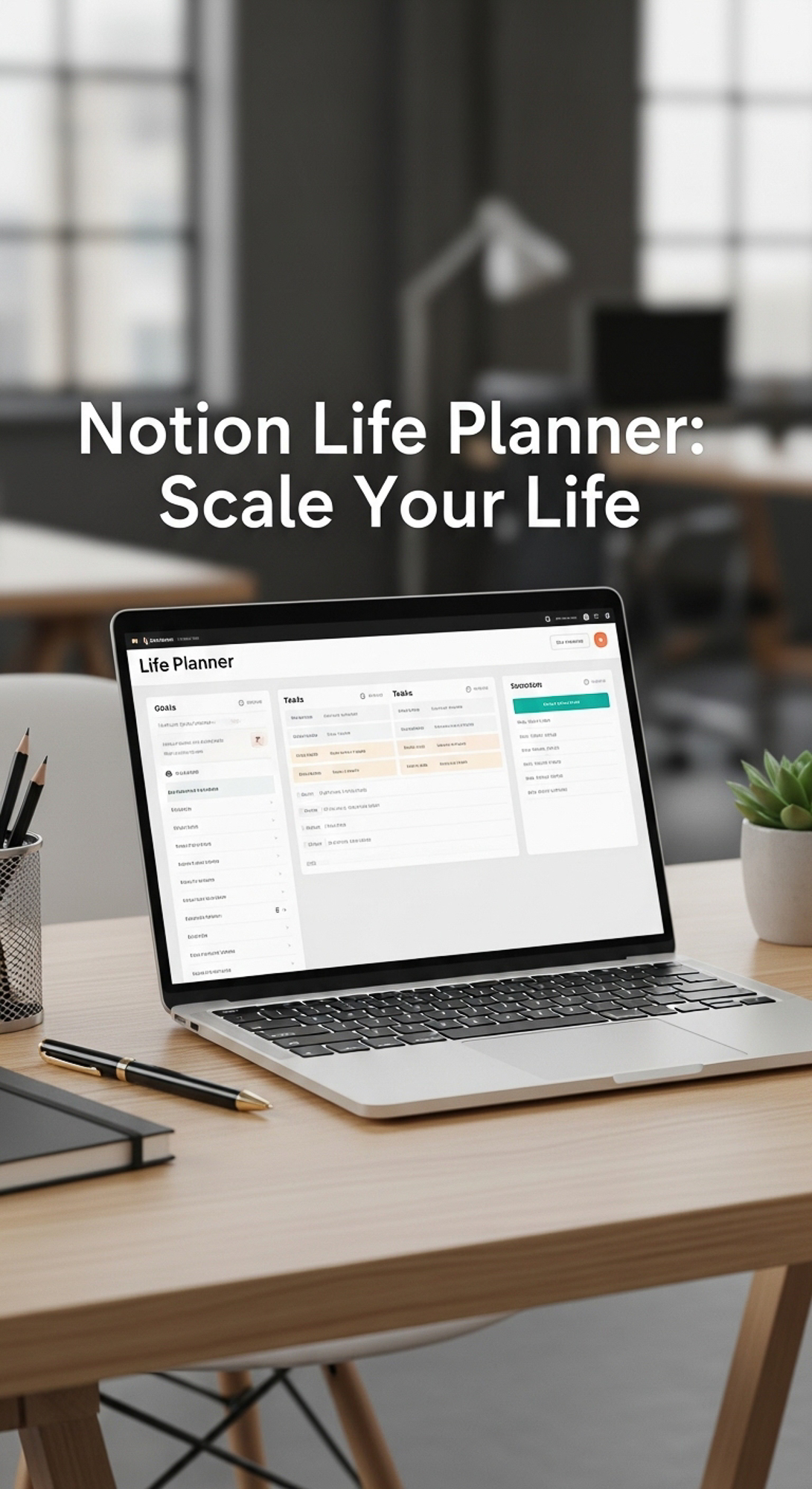 A professional agency desk with a laptop showing a Life Planner overlay text Notion Life Planner Sca
