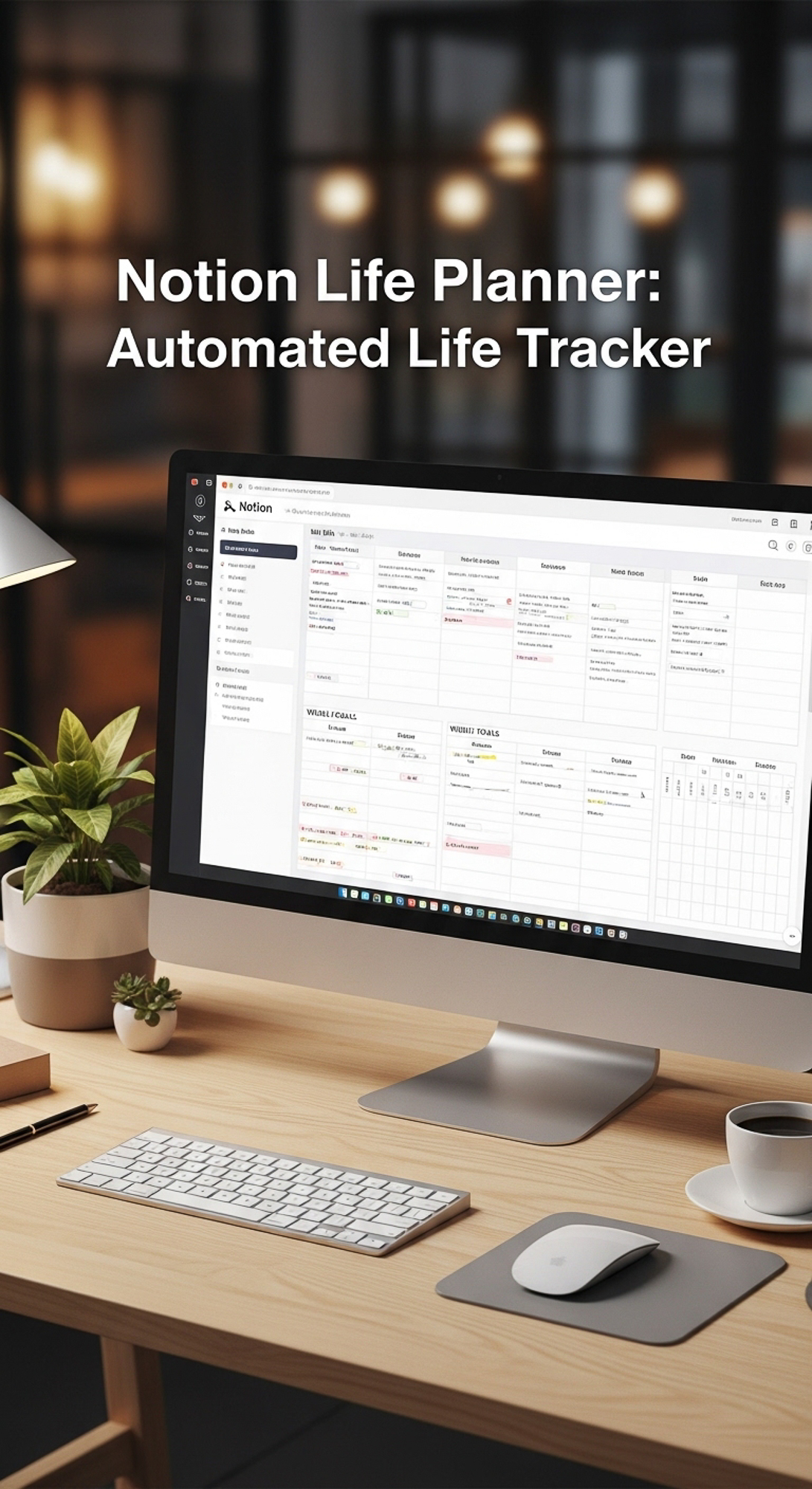 A professional desk with a Notion Life Planner on screen overlay text Notion Life Planner Automated