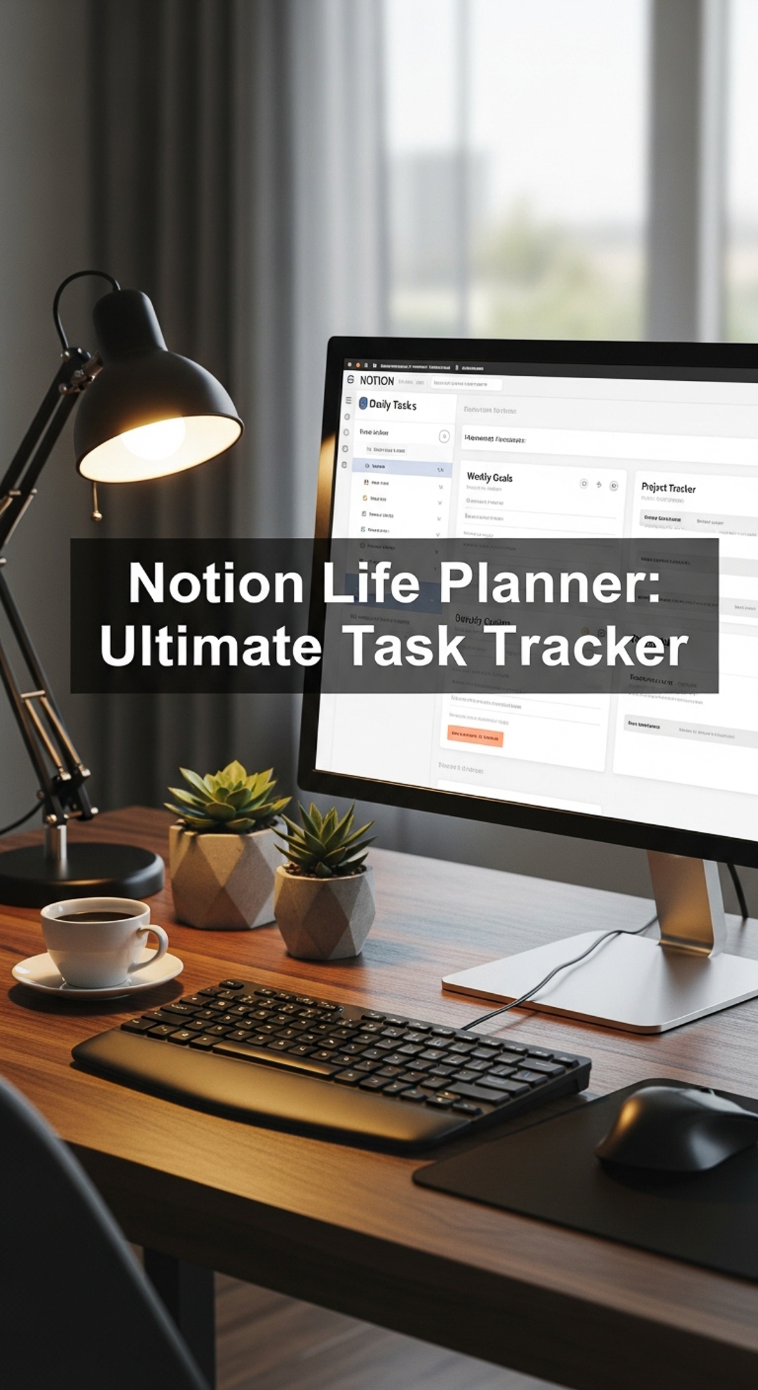 A professional desk with a Notion Life Planner on screen overlay text Notion Life Planner Ultimate T