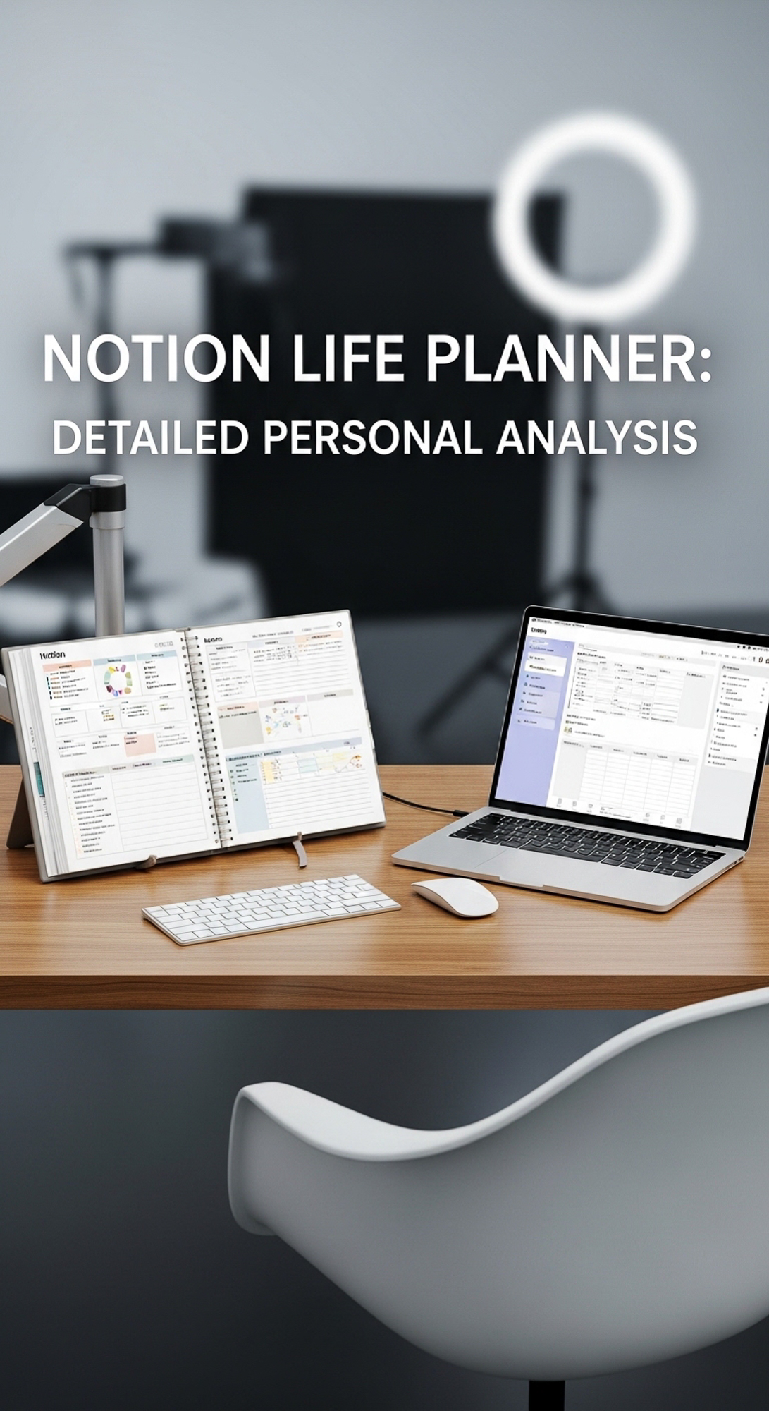 A professional studio with a Notion Life Planner overlay text Notion Life Planner Detailed Personal