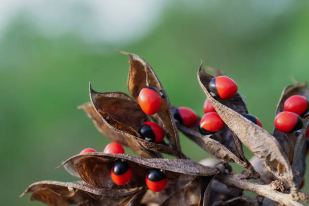 A selective focus shot of rosary pea flower plant with red beans and brown leaves