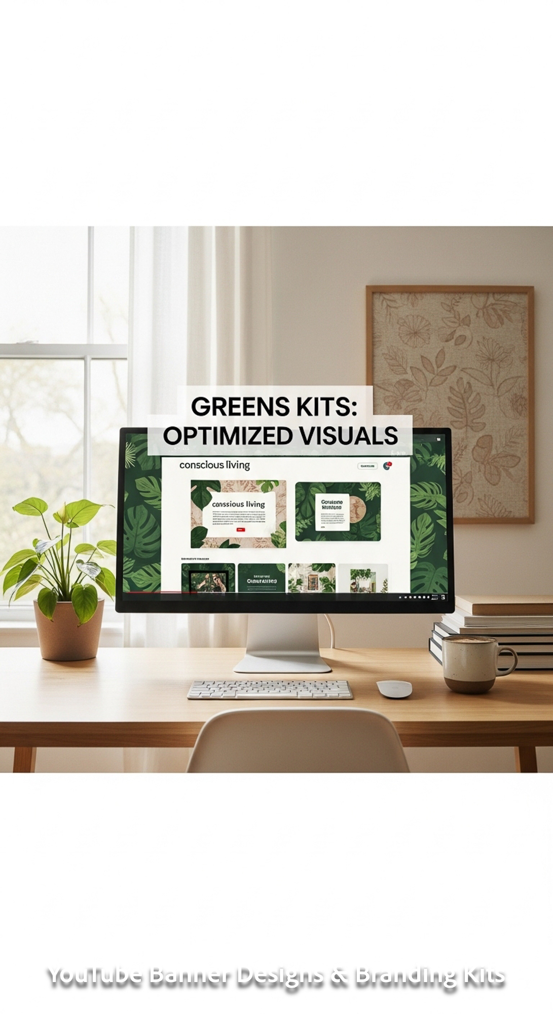 A serene workspace with plants and a monitor displaying a conscious living channel kit overlay text